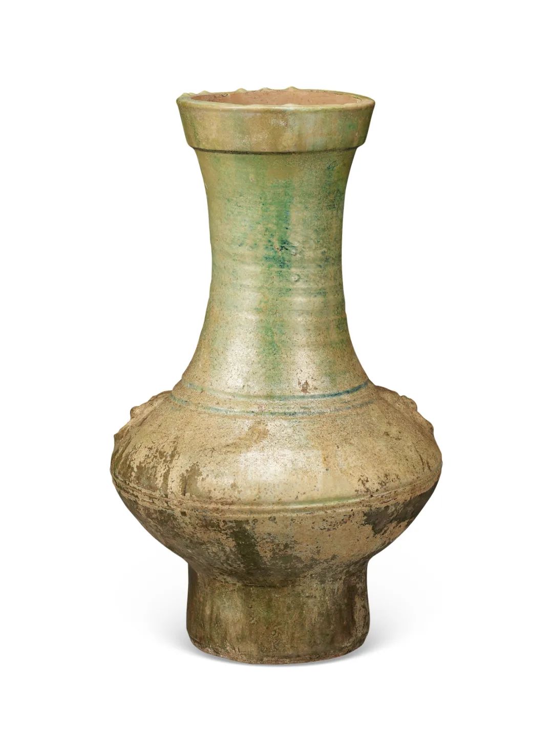 Lot 46「漢綠釉大壺」此壺盤口折沿,左右貼塑鋪首,器身飾弦紋數道,高圈足,器身滿施綠釉,釉面歷經千年仍晶瑩剔透,上閃蛤蜊光五彩斑斕。整體器型端莊沈穩,釉色飽滿典雅,爲漢綠釉之少見器物。