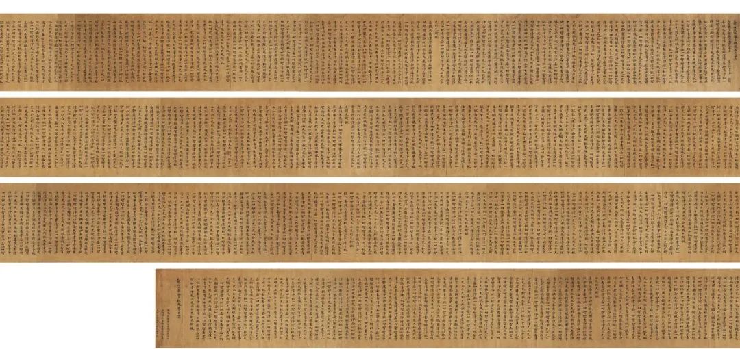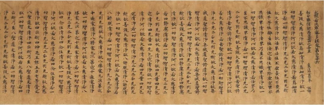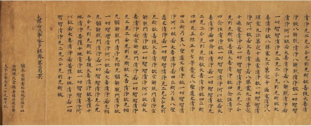 《大般若波羅蜜多經》卷第二百卅六,本卷軸裝,長900釐米,高25.5釐米,黃麻紙,卷尾款書“大般若波羅蜜多經卷第二百卅六”及“願奉聖朝壽祚恒延衍福,百姓去禍釀災,常遇善緣,必成正果。天平十年(738)五月一日光明子記。”天平十年,日本國內天災不斷,災難降臨,禍害不斷,人們深受貧病饑餓之苦,光明皇后心系百姓,為民祈福,書此長卷。本卷乃日本賢后所書,書風嚴謹,盡顯唐人法度,是奈良時期皇室重要遺物,今人視之當奉為圭臬。