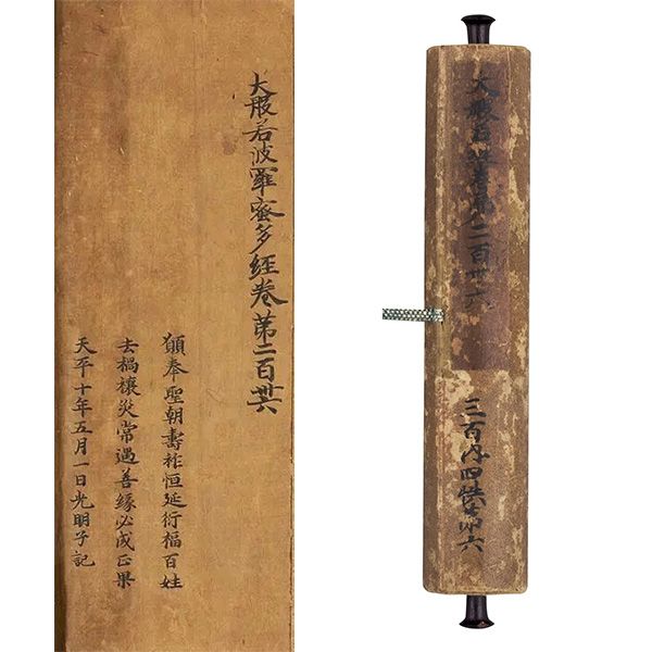 《大般若波羅蜜多經卷》由唐玄奘譯,本卷為第二百卅六卷,大般若波羅蜜多為梵文的譯音,意思為:到達彼岸的大智慧經法。般若為智慧;波羅蜜多為彼岸到達,是佛陀講述諸法皆空之義的大乘般若類經典的彙編。日本奈良時期“光明皇后”書於天平十年,即西元738年。