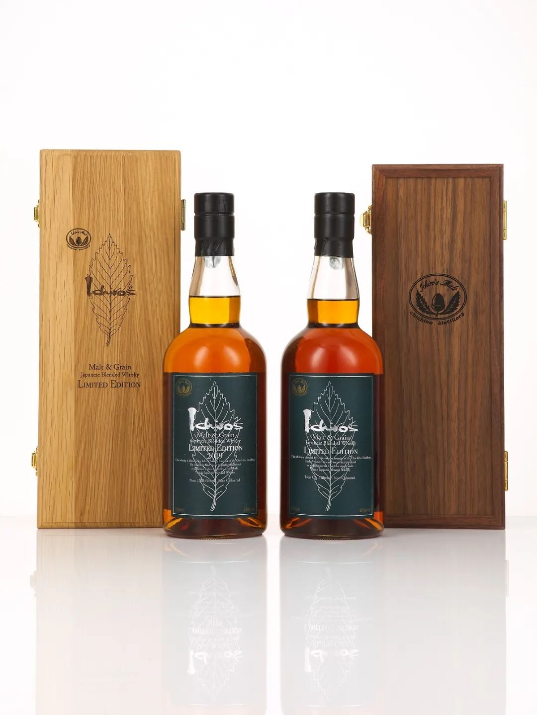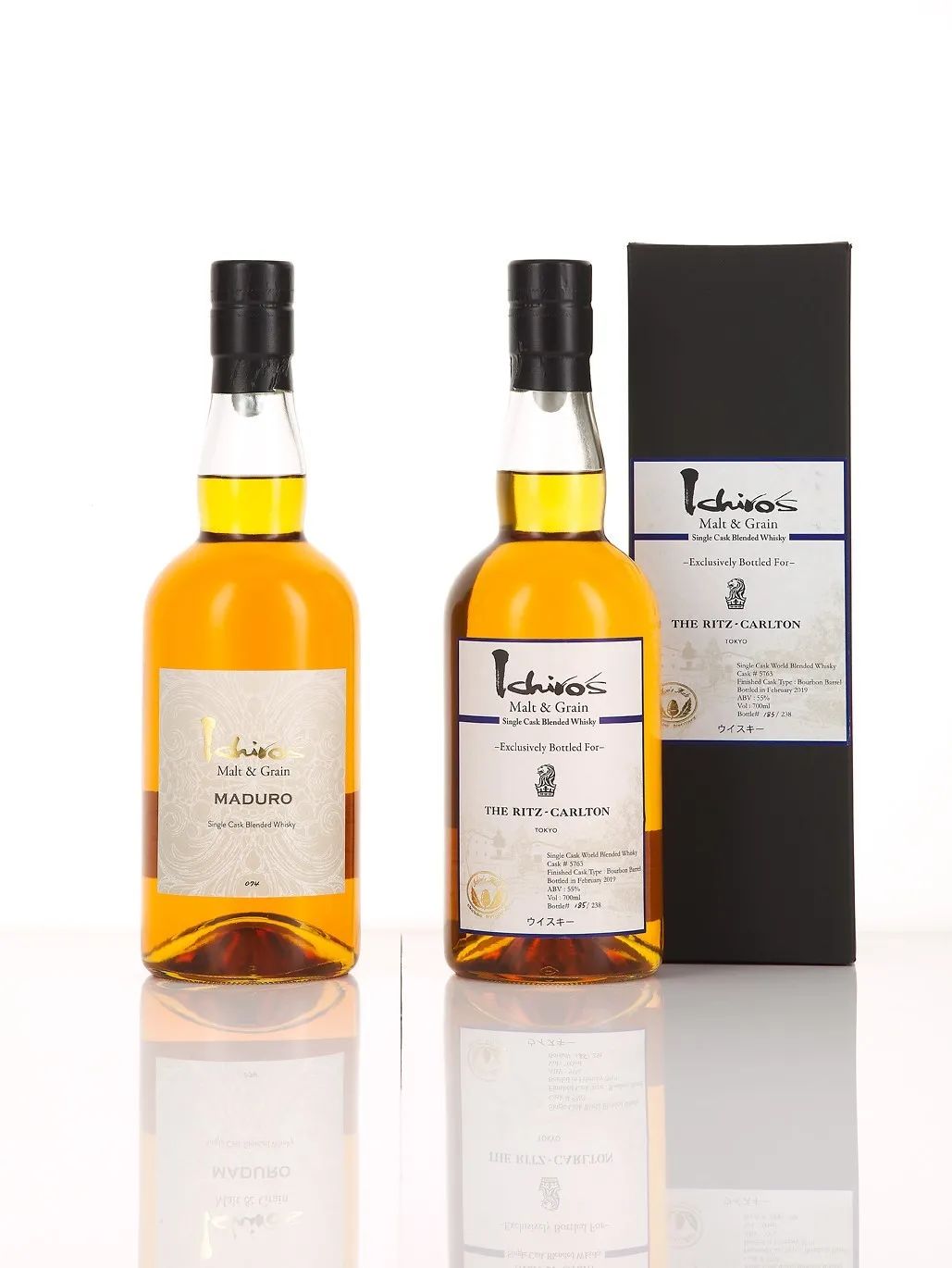 此組為知名的Ichiro’s Malt & Grain系列,左邊這瓶來自東京知名的君悅酒店 Grand Hyatt Maduro爵士酒廊限定,Maduro Bar的首席調酒師和伊知郎社長為此瓶調和了來自日本、蘇格蘭、愛爾蘭、美國、加拿大四個地區的酒齡高達20年的單一麥芽及單一穀物威士忌,並加入了羽生、秩父和川崎三個蒸餾廠日本產原酒,於2016年裝入法國橡木桶中進行3年的陳釀。限量256瓶。