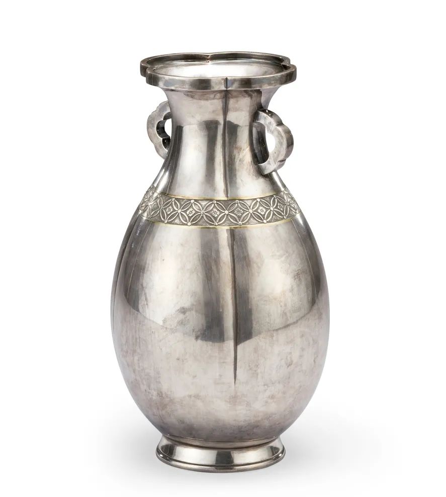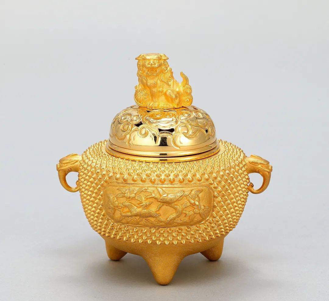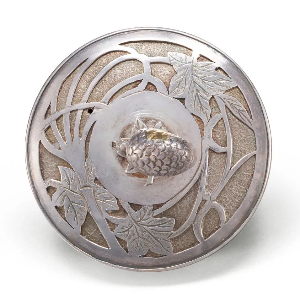 以下Lot 534金壺及Lot 535金香爐均由以鍛金霰紋技巧著稱的日本金工師石黑光南精心鑄造。石黑光南先生師古而不泥古,他對於古代金銀器造型藝術有著獨到理解,同時又具備極強的創新精神,他的作品雅氣十足且具有時代感。所謂「霰」,即「雪珠」之意,這種驚艷世人的玉霰與敲打技法,就是由石黑光南家族所獨創。他創造出超高難度的「玉霰」與「敲打」系列制品,被推崇為「東京銀器第一人」。