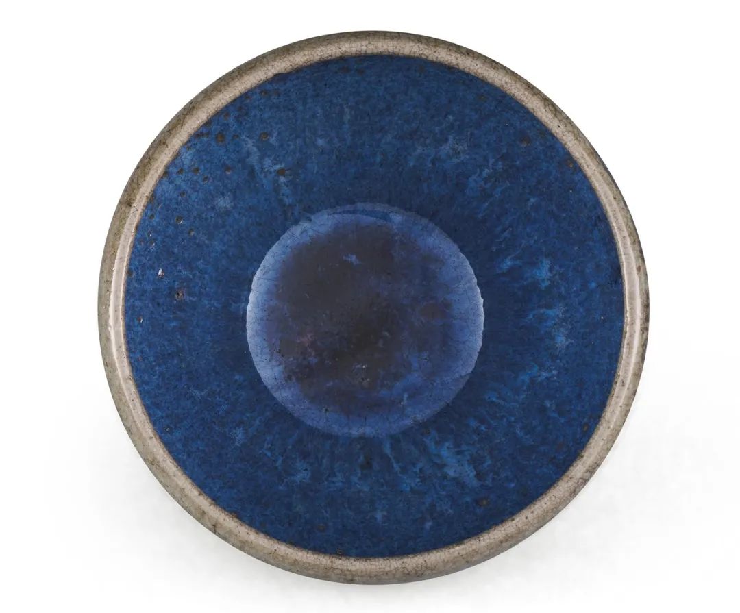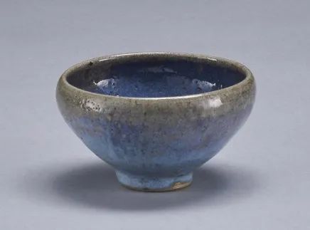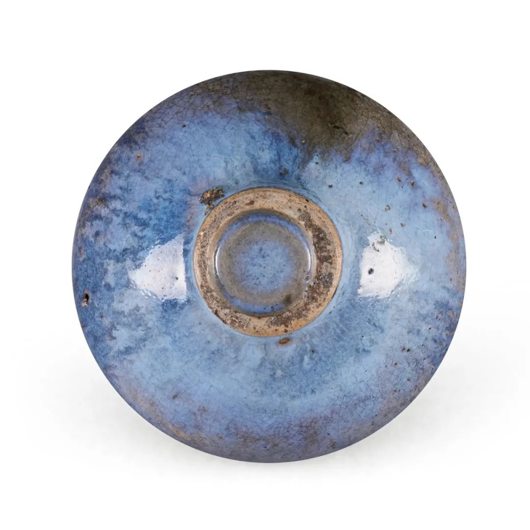 鈞釉小盞,口內收,圈足,釉面晶瑩剔透,薄釉處胎體清晰可見;肥厚處,釉水堆積,釉色深藍而沈靜。