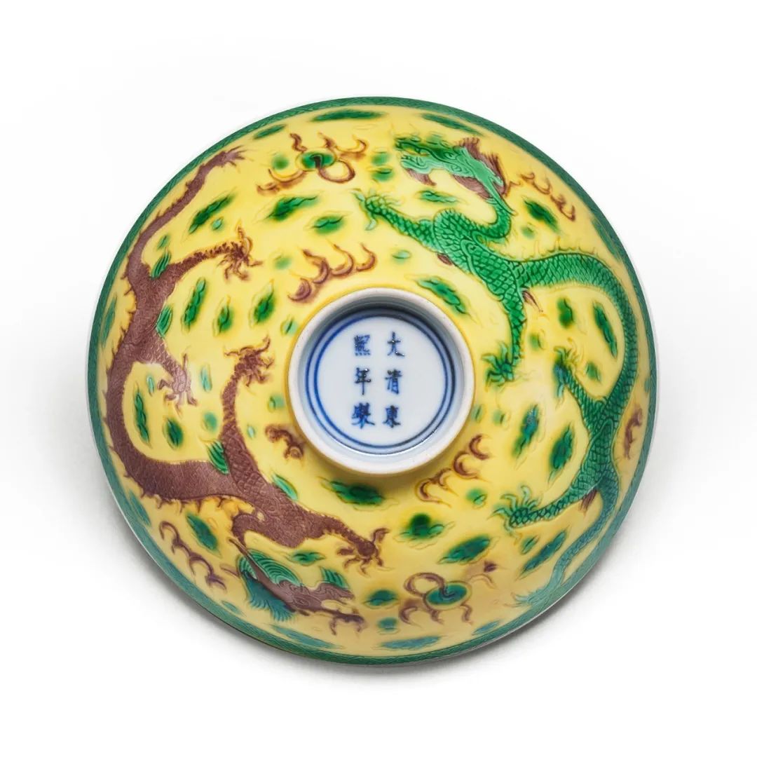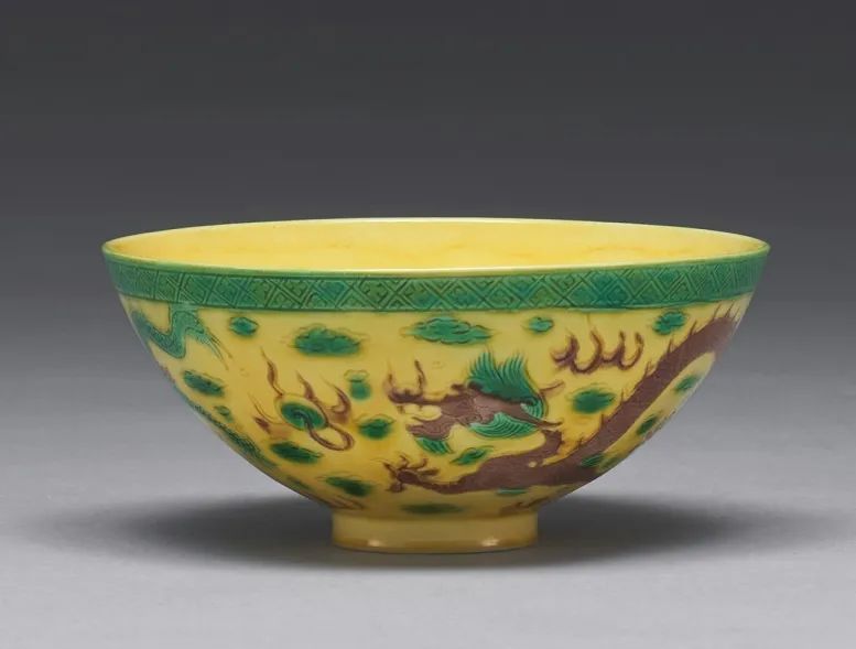 QING DYNASTY A FINE YELLOW-GROUND GREEN-ENAMELED 'DRAGON' BOWL
