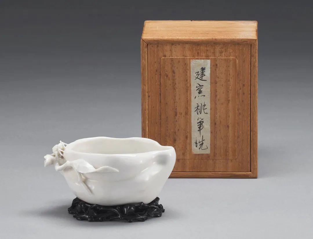 小洗德化窯白瓷製成,通體潔白如玉,釉面溫潤如脂。形作折枝桃實形,折枝處有一蜘蛛貼附其上,惟妙惟肖,極爲可人。德化窯曆來以仿生瓷最爲著名,各式佛仙人物,瓜果桃李,均神形兼備,備受曆代文人雅士喜愛。此器配紅木镂雕底座,外配桐木盒,爲細川先生頗爲喜愛之案頭文玩之一,可寶可藏。