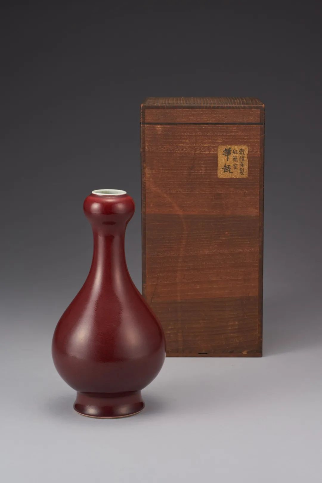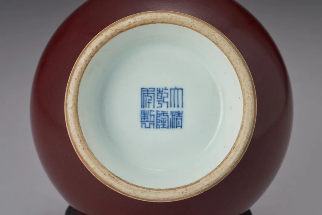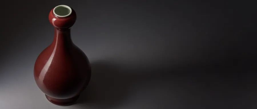 乾隆一朝崇古摹古,此作品造型取法於秦漢銅器——蒜頭瓶,蒜頭形口,小口圓唇,束頸細長,圓腹鼓起,高圈足外撇,體態輕盈秀美。通體光素無修飾,整器施祭紅釉,釉質肥厚,釉層平滑明潤,色澤均勻沉穩,濃郁潤澤,寶光內蘊,盡顯深沉高貴。清道光朝龔洵在所編《景德鎮陶歌》中稱:“官古窯成重霽紅,最難全美費良工。霜天晴書精心合,一樣摶燒百不同。”由此可知,燒造一件顏色均勻亮麗的霽紅釉器,並非易事。足底與瓶內施白釉,淡泊素雅,與祭紅釉的色調形成強烈視覺對比,足底青花書“大清乾隆年製”六字三行篆書款,笔力精練有神。整器器型秀美周正,線條流暢,色澤純正艷麗,為乾隆祭紅釉水平之典範。