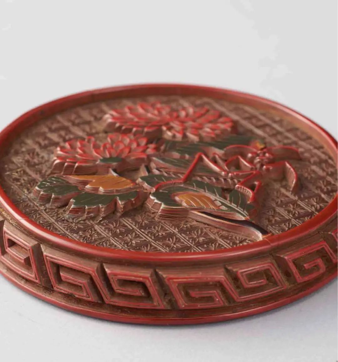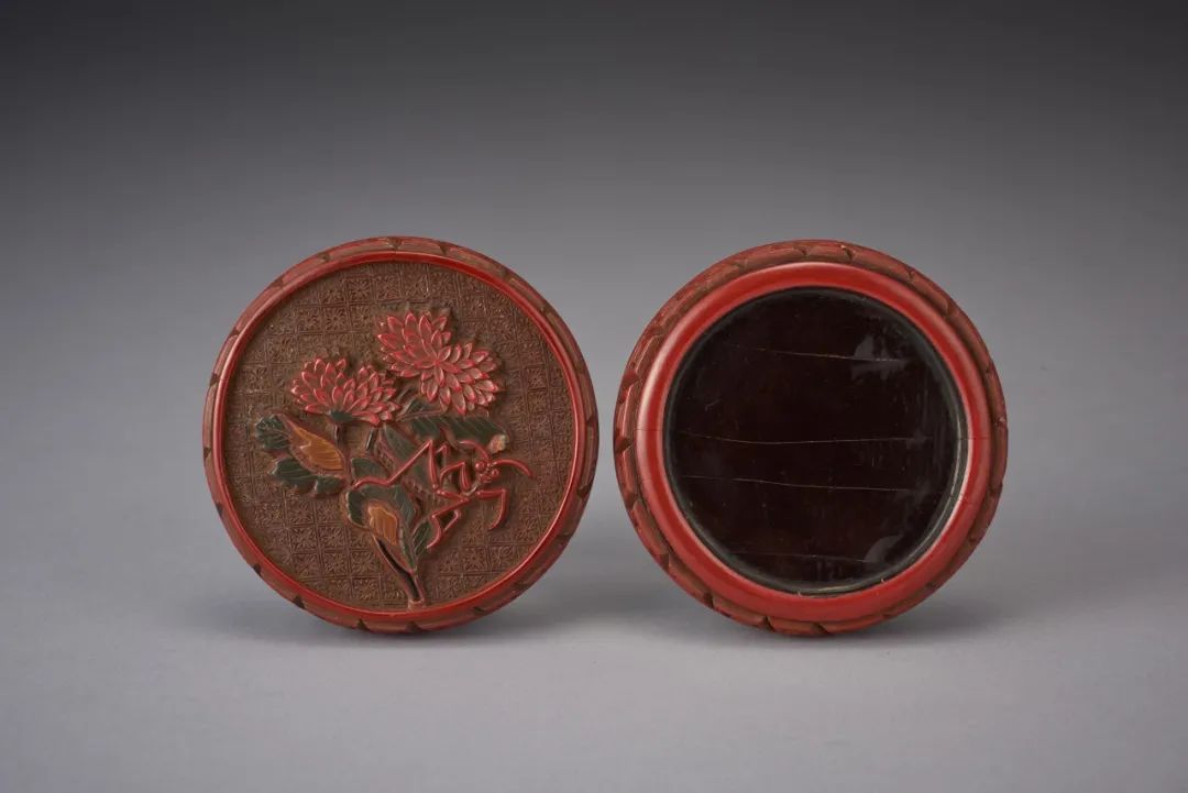 此剔彩香盒小巧精緻,秀雅華美,作子母口,口沿雕如意紋,通體為木胎,漆色瑩潤亮麗,堆漆肥厚,使剔作之中形成浮雕效果。盒面中心作兩朵綻放菊花,花瓣層層綻放,花朵飽滿,以深綠色漆面表現葉片,線條流暢自然。一螳螂俯於綠葉上,螳螂雕刻生動自然,細節處理精細,立體感極強。