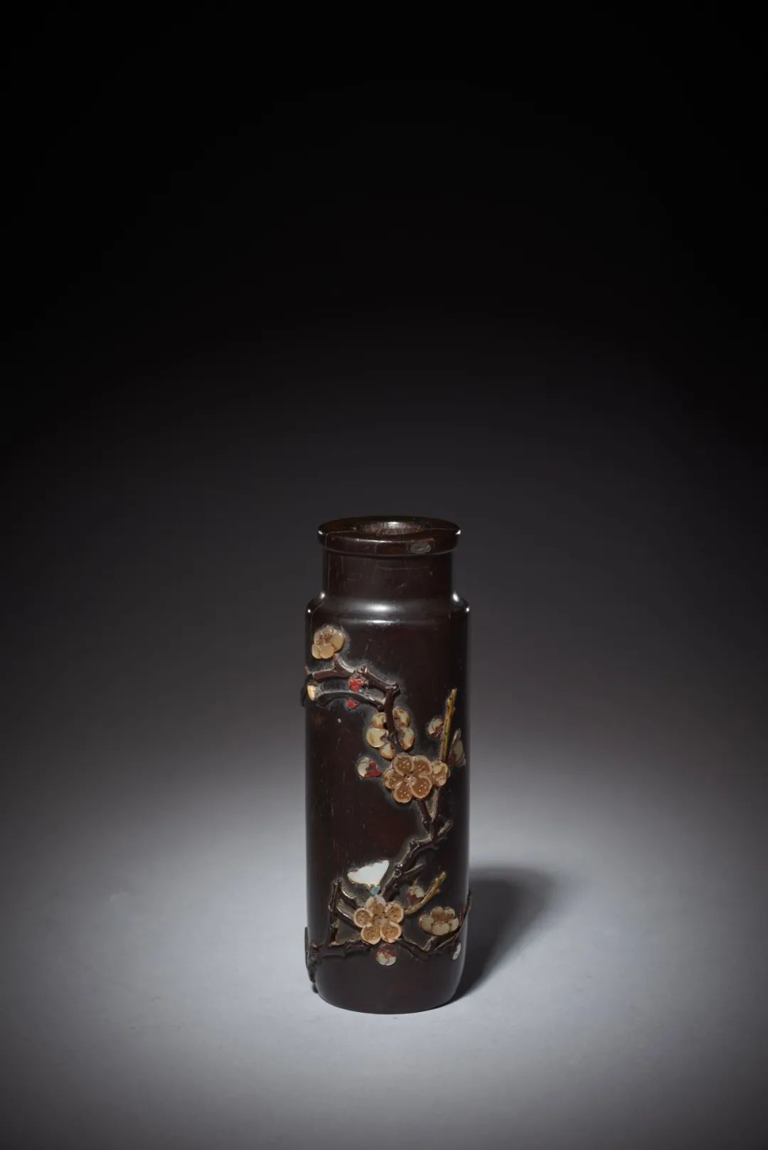 此件花插取紫檀整木深挖而成,器呈直筒形,唇口,束頸,器身百寶嵌作滿開臘梅紋,花插所嵌之物,材料極爲奢華,有螺鈿,瑪瑙,象牙等。所飾梅枝盤紮,梅花或滿開鬥艷,或含苞欲放,均惟妙惟肖,清雅至極。