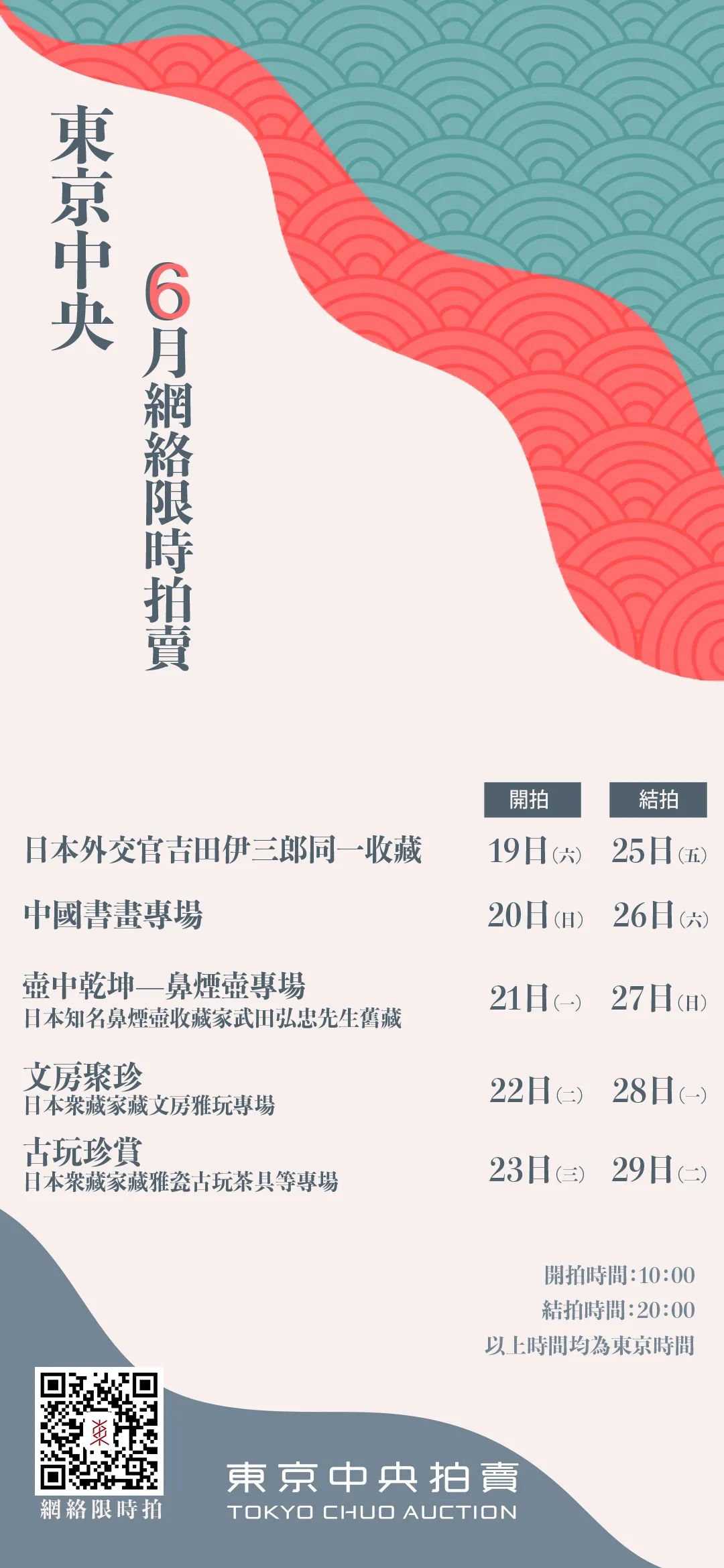 東京中央6月網絡限時拍將於6月19日開拍,屆時將有【日本外交官吉田伊三郎同一收藏】、【中國書畫】、【壺中乾坤——日本知名鼻煙壺收藏家武田弘忠先生舊藏鼻煙壺】、【文房聚珍——日本眾藏家藏文房雅玩】、【古玩珍賞——日本眾藏家藏雅瓷古玩茶具等】等專場。您可隨時隨地通過東京中央網絡限時拍輕鬆購買心儀之物,現呈拍賣具體日程表,敬請惠存!