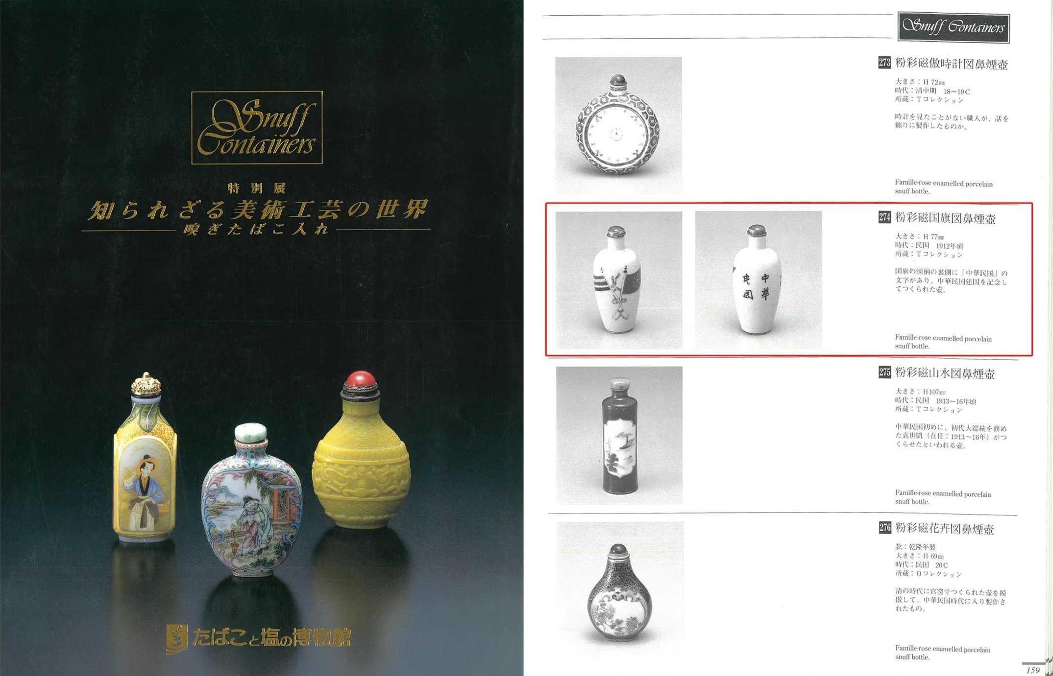 出版:①《知られざる美術工芸の世界嗅ぎたばこ入れ特別展》武田弘忠王冠宇等編輯,たばこと塩の博物館出版發行,1998年三月,P159,N0274粉彩旗幟圖鼻煙壺。