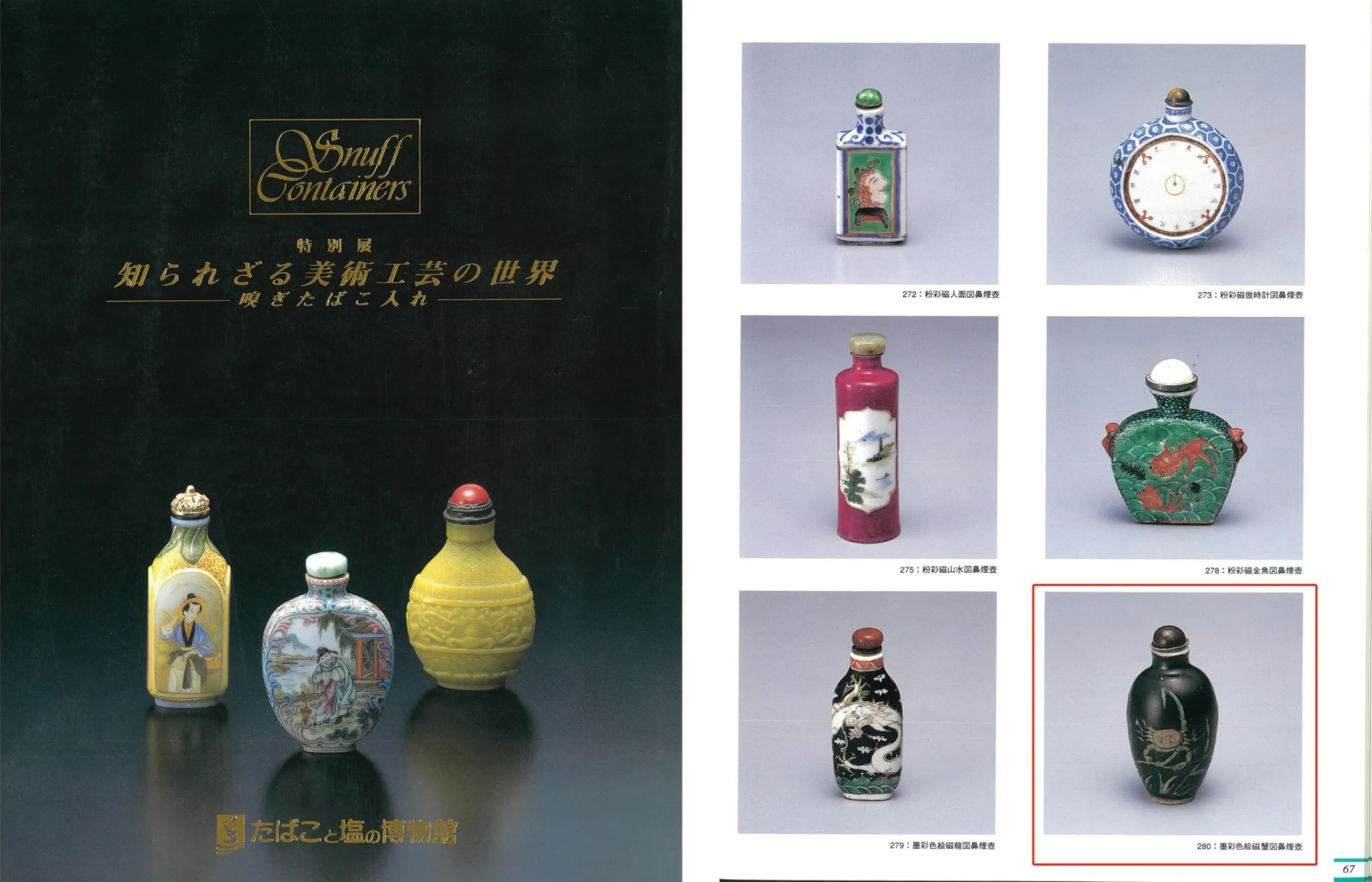 出版:《知られざる美術工芸の世界嗅ぎたばこ入れ特別展》武田弘忠王冠宇等編輯,たばこと塩の博物館出版發行,1998年三月,P67,N0280粉彩黑底螃蟹圖鼻煙壺。