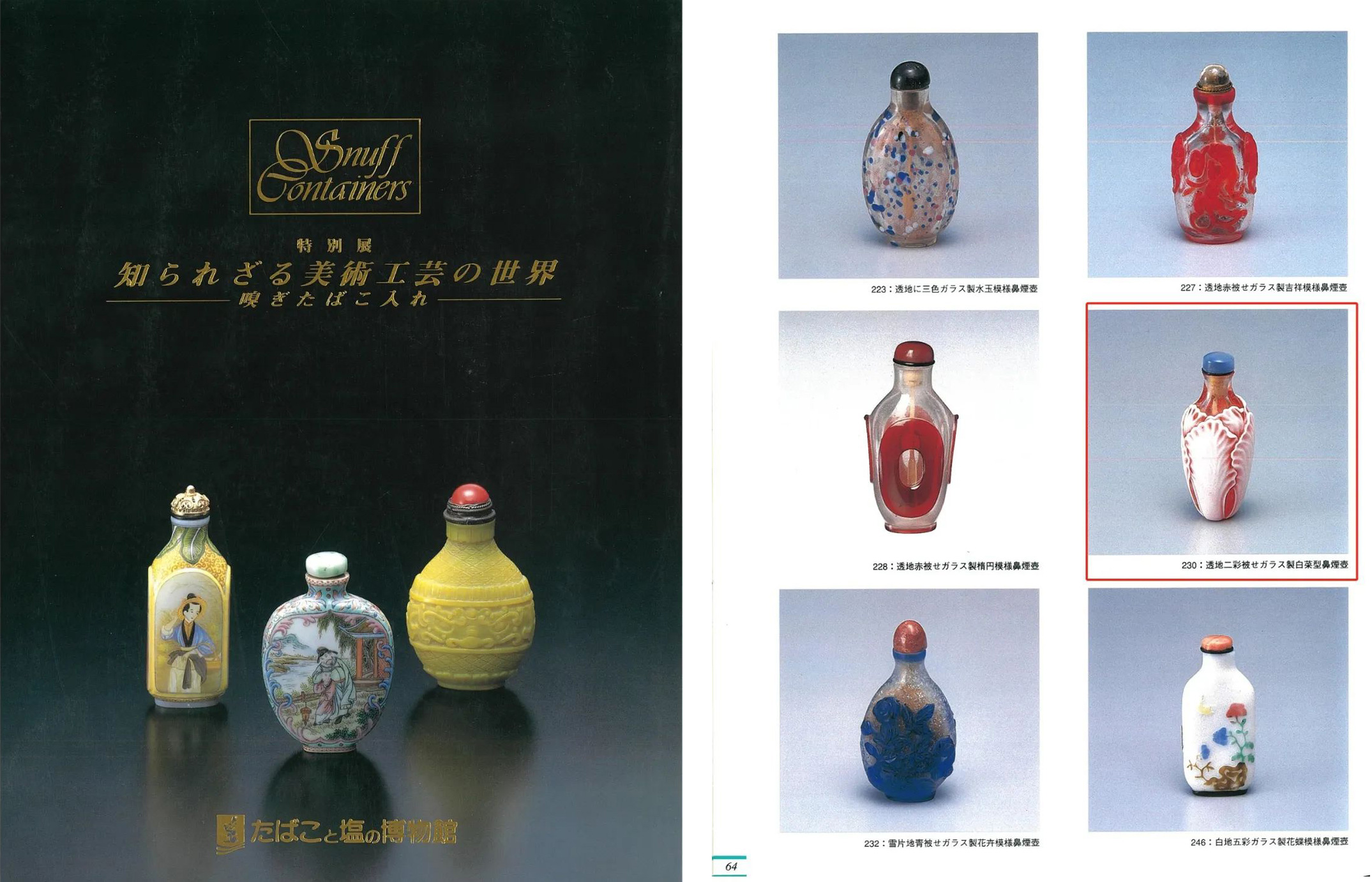 出版:①《知られざる美術工芸の世界嗅ぎたばこ入れ特別展》武田弘忠王冠宇等編輯,たばこと塩の博物館出版發行,1998年三月,P64,N0230紅透明地套白玻璃花葉形鼻煙壺。