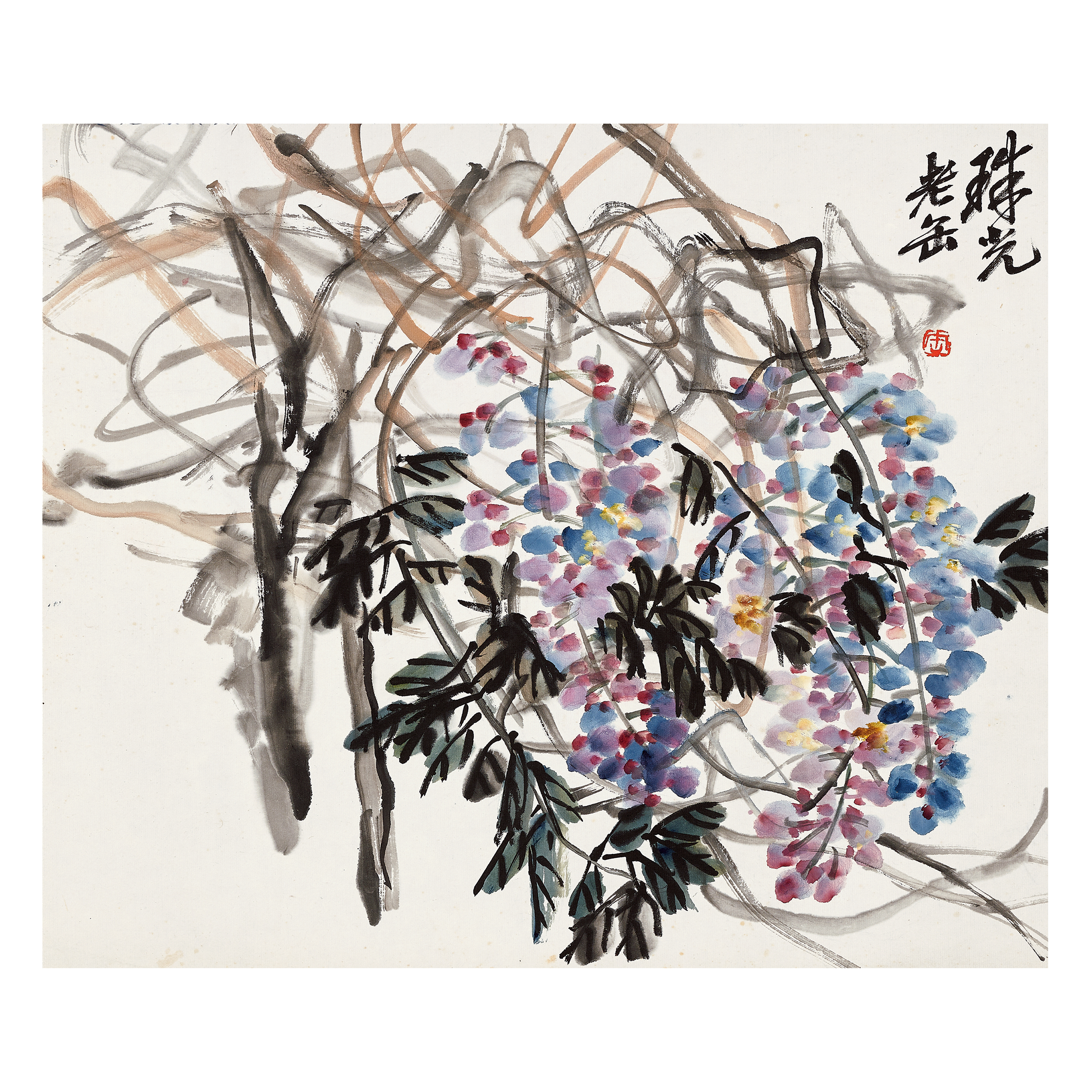 此幅缶翁自題「珠光」,寫春日盛開的淩霄花藤,大長線條寫藤,精短線條脈葉,篆籀金石味濃郁而和諧,正是其以書入畫精彩之所在,控筆之力叫人嘆為觀止。其賦彩可謂是歷代寫意畫家中最善用色者,此畫之設色中便可見一斑。紫、藍、黃入赭墨,沖突中見協調,極其講究,卻能雅俗共賞,引人入勝。花葉層叠,層次豐富,墨彩濃淡變化相間,然畫面卻見生動而非繁復,見逸趣而非矯揉。行書款字開門見山,左撇尤為得力。用印端莊考究,堪稱完美,雖為小品,卻濃縮缶翁一代大師的絕學,洵可謂寶也。