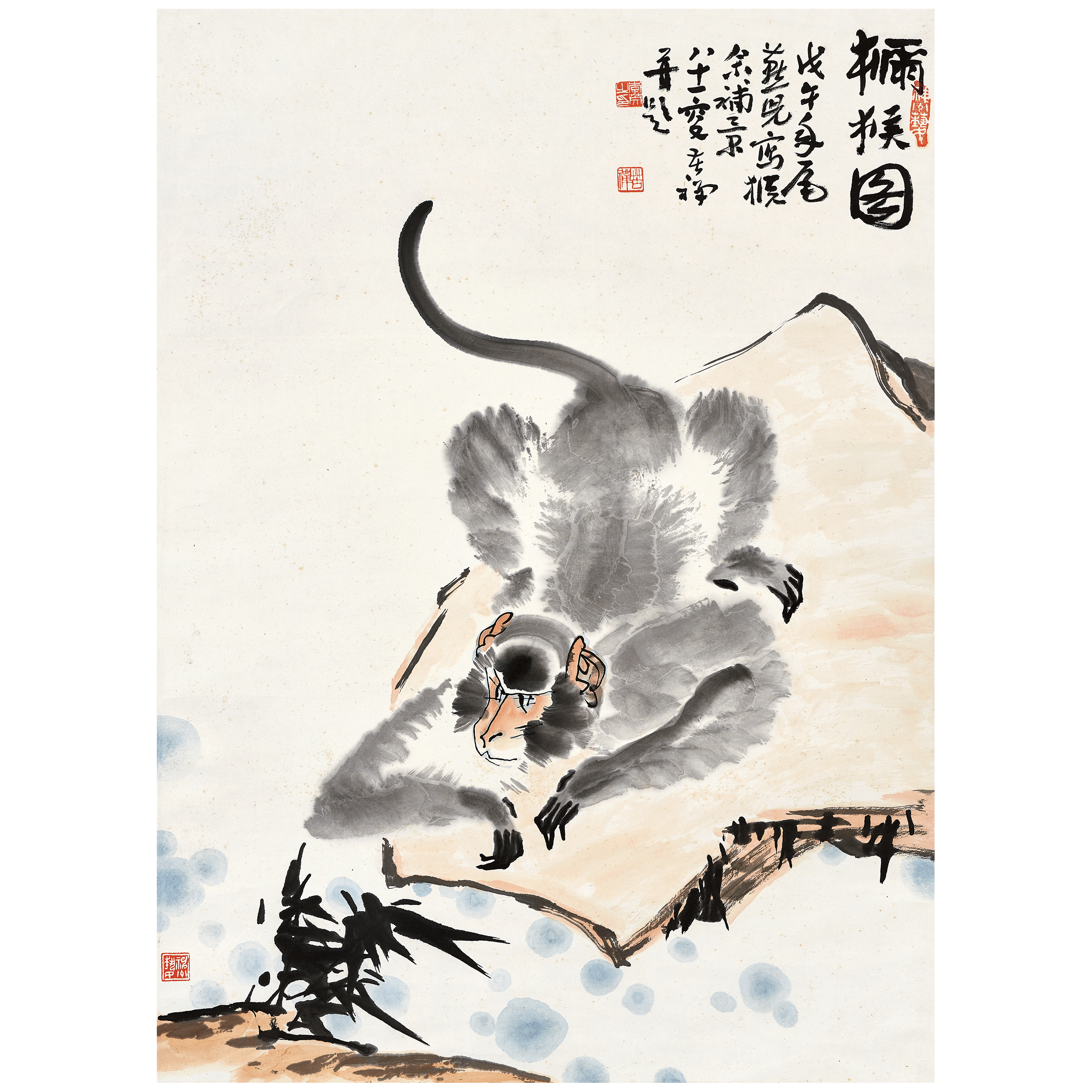 說明:此幅猿猴圖為李苦禪、李燕父子合作,李燕畫後,苦禪補景題字。李苦禪乃齊白石門人中最得恩師看重,有其獨立的藝術面貌。而李燕筆墨得家傳法度,更是跟隨了父親作畫精神,於題材上另闢蹊徑,追求獨立的藝術面貌,在其父李苦禪先生鼓勵下,李燕以大寫意畫猴,借鑑齊白石、劉繼卣等畫猴名家,注重寫生與繪畫技法的錘鍊,自出機杼。其筆下的猴子千姿百態,憨態可掬,充滿了童趣和靈性,每每表現出一種吉祥歡慶的氣氛。李燕作畫藉助現代工具,令水墨產生洇化效果,既能表現猴子毛髮蓬鬆質感,亦令畫面呈現出空間感。是作有其父幫襯題署,字畫合璧,父子情深,俱在畫中。