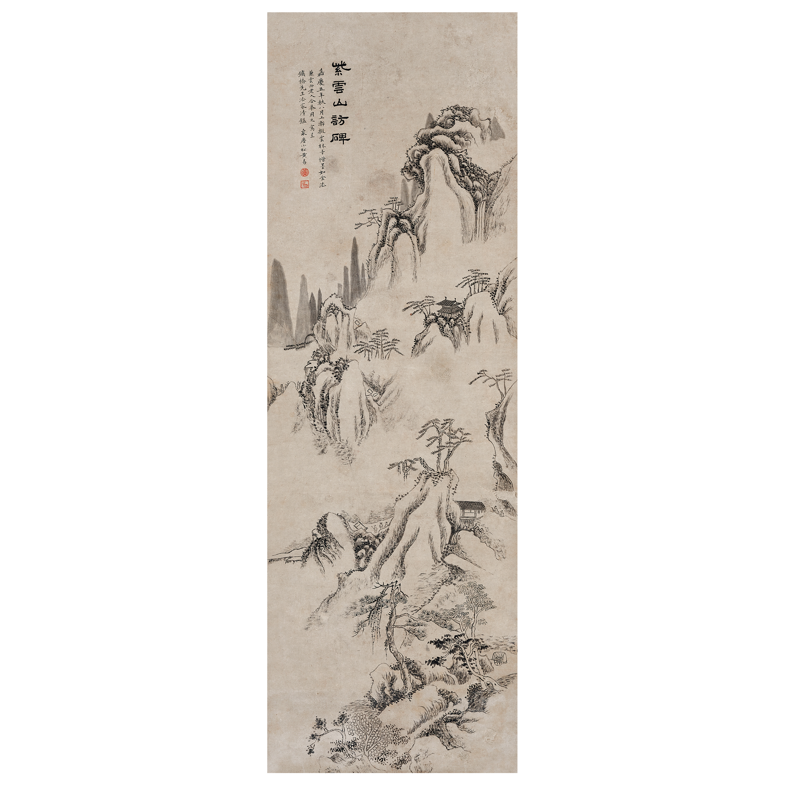說明:黃小松乃西泠八家之一,書畫篆刻俱能。細看黃氏此畫,全畫以水墨寫成,簡澹幽遠。此畫大概是當時黃易至紫雲山訪碑時所見之情景。清代文人有訪古尋幽之風,不少書畫篆刻大家都有此癖好,而且很多都根據自己的遊歷,著書立說,黃易也正是這樣的人。全畫盡見黃易游山賞樂之狀,其筆法輕盈鬆動,刻畫自然樸素,看似畫法簡單,卻少了許多山水畫家的工匠氣與程式化,隨意而不缺飄逸之氣。從落款又可知此境乃寫生所得,又觀畫面,又不失為畫家胸中丘壑也,一片生機,全自此處。凡畫山水者,必先胸懷廣大,方能容得下高山流水,若胸懷狹隘,能做此高山止仰止也。文人畫貴在自然而不拘小節,加之度量長遠,隨性下筆,則是生機勃然,一任隨之。
