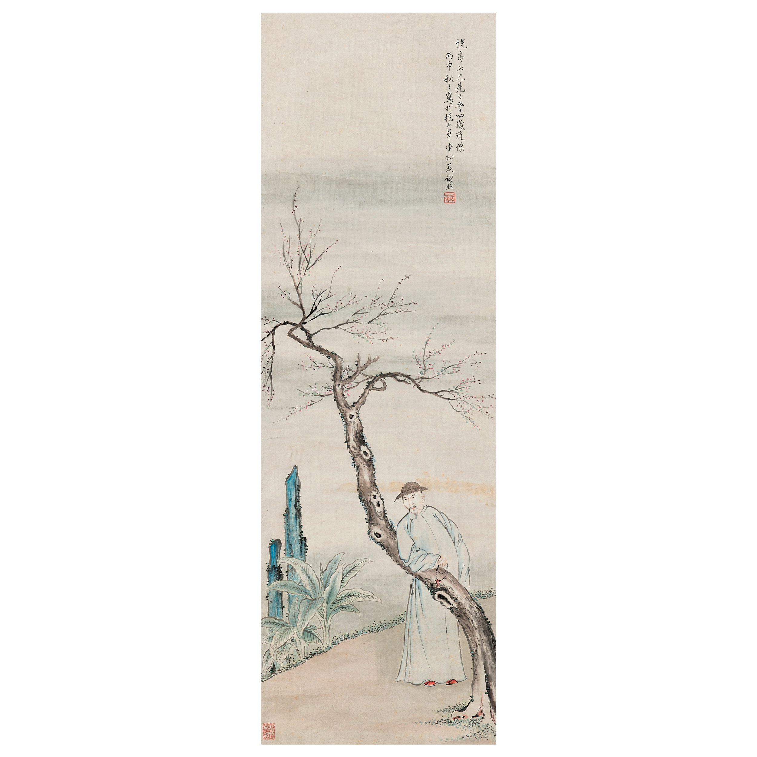 款識:悅亭七兄先生五十四歲逍像。丙申秋日寫於抱山草堂,叔美錢杜。