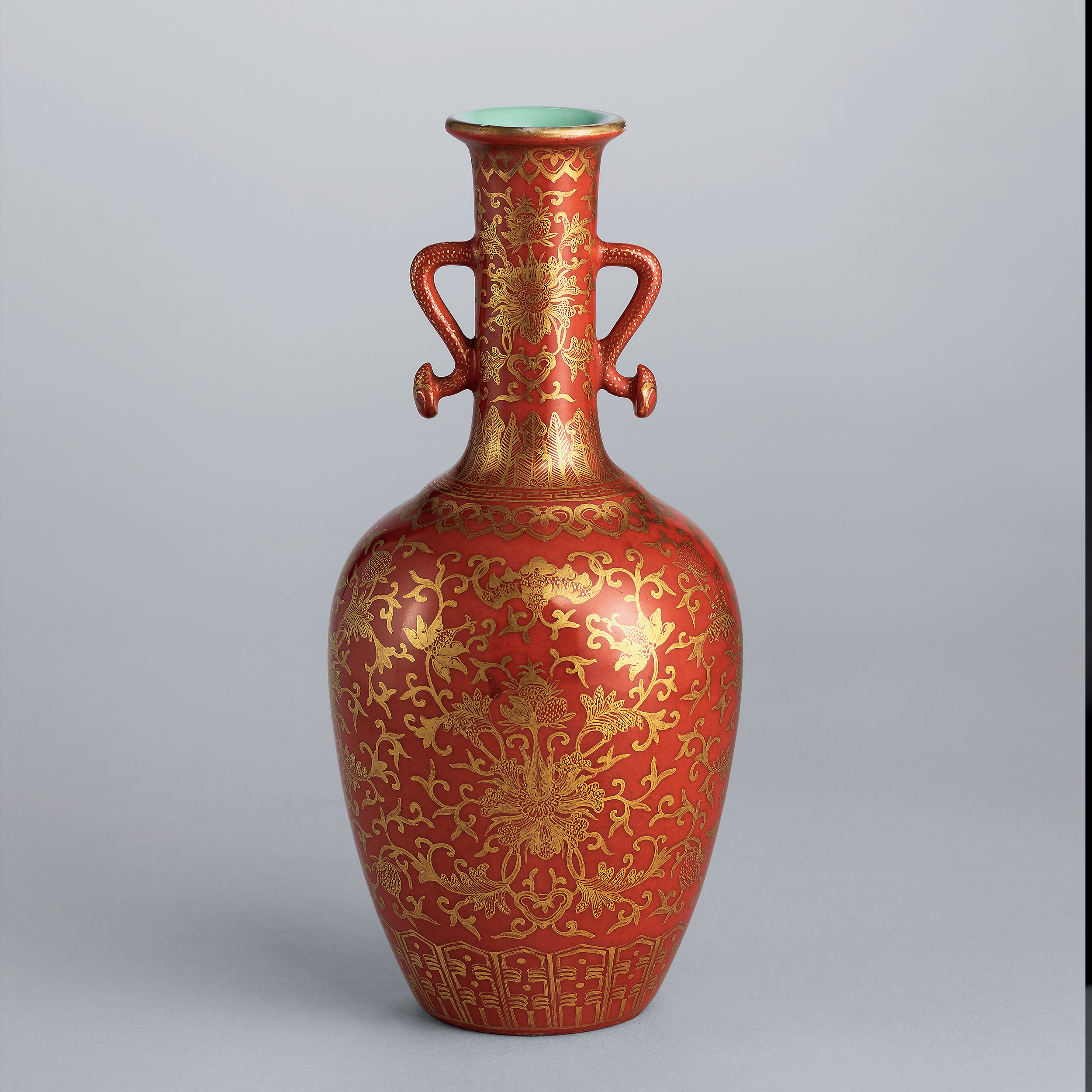珊瑚紅地描金纏枝蓮紋如意雙耳瓶