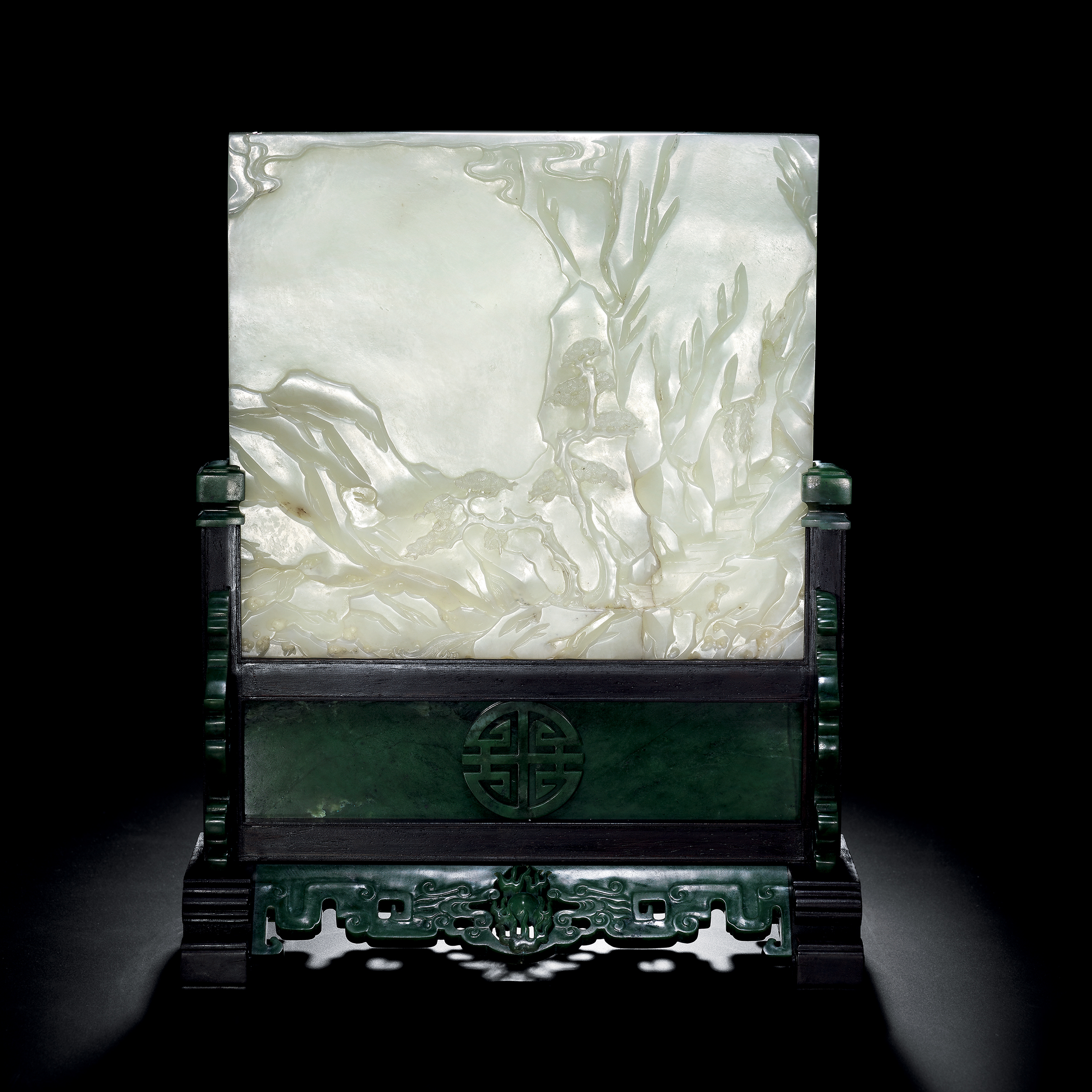此插屏由整塊白玉雕琢而成,玉質溫潤細膩,晶瑩剔透,寶光內斂,包漿潤澤,色純雅緻。插屏採雙面雕工,正面浮雕遊歷黃山之景,遠觀山石峻峭,翠柏蒼松,亭台樓閣間雲霧繚繞,兩老者結伴而行,於山間相談盛歡。近觀小溪湍湍,怪石嶙峋,松柏高聳入雲,三位老者悠閒自若地慢步於山間小路,細細的觀賞品味眼前這絕美的景色。背面同樣浮雕山石、松柏之景,與前面遙相呼應。整塊插屏刀法圓潤深峻,細膩流暢,畫面佈局合理,內容豐富,人物刻畫生動形象,層次感強。更為難得的是此插屏配有紅木嵌碧玉台座,玉質蔥翠,高雅沉穩,台座中央的碧玉板前後均刻有壽字紋,下方鏤雕雙龍戲珠紋,紋飾華美,盡顯皇家氣派。