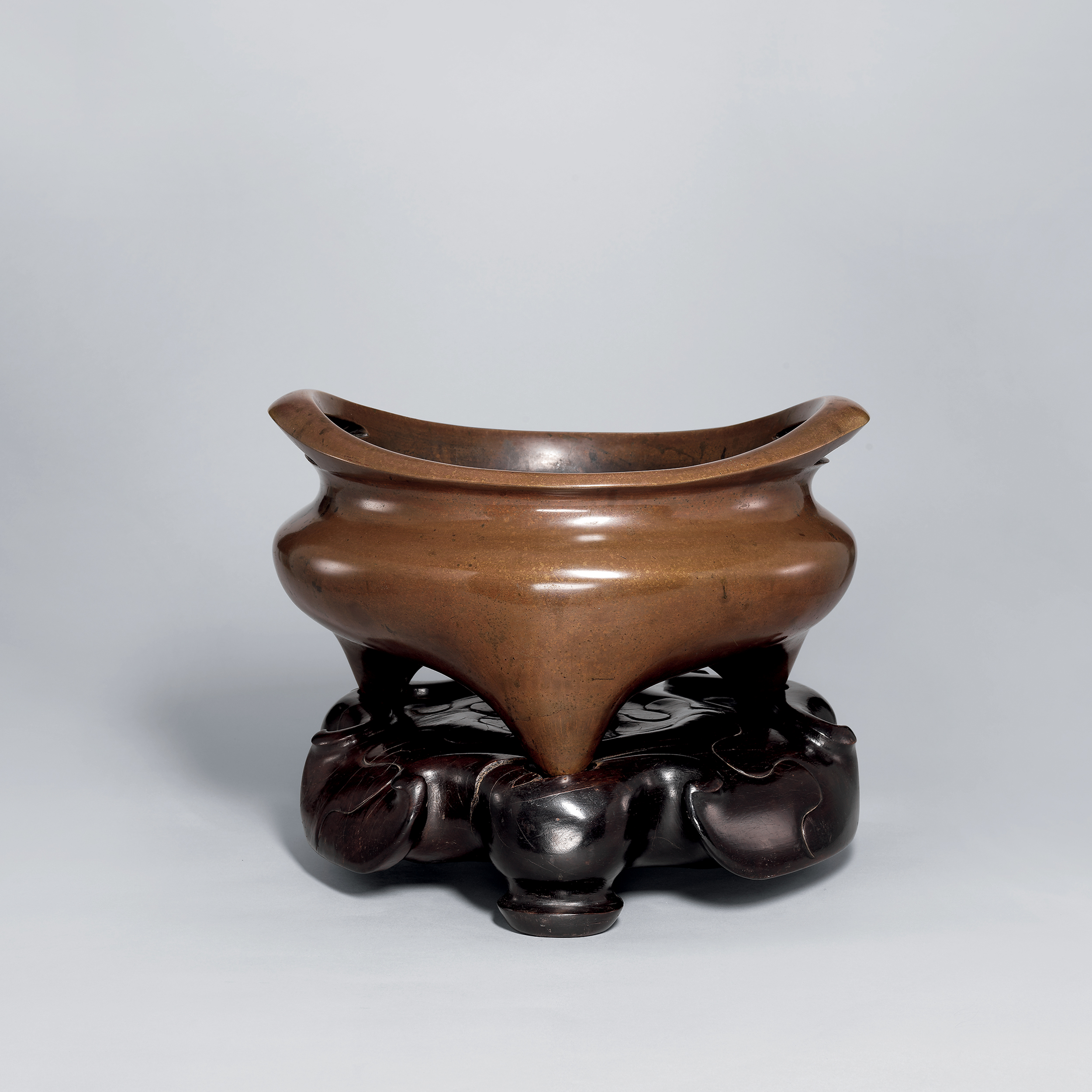 此香爐銅製而成,圓口,口沿有雙橋耳,形似鳳眼,束頸,扁腹,光素無紋,下承三足,包漿自然油潤,帶酸枝木製底座。底部鐫刻“大明宣德年製”款。宣德香爐是中國歷史上第一次運用黃銅鑄成的銅器。為製作精良銅爐,明朝宣德皇帝曾親自督促,這在歷史上實屬少見。宣德爐是明代工藝中的珍品,铸炉在铜质内加有金、银、锡等物其他礦物質,所以炉器所泛之光也各有不同。王世襄先生曾有养炉、烧炉之说,重视炉具品系,更为古时文人雅士炉文化的余韵。此爐形制古樸大氣,通體光素,光華內蘊,溫潤如玉,盡顯天然銅質之美。宛然似一道釉宋窑瓷器,光彩照人,为典型明代炉中之精品。