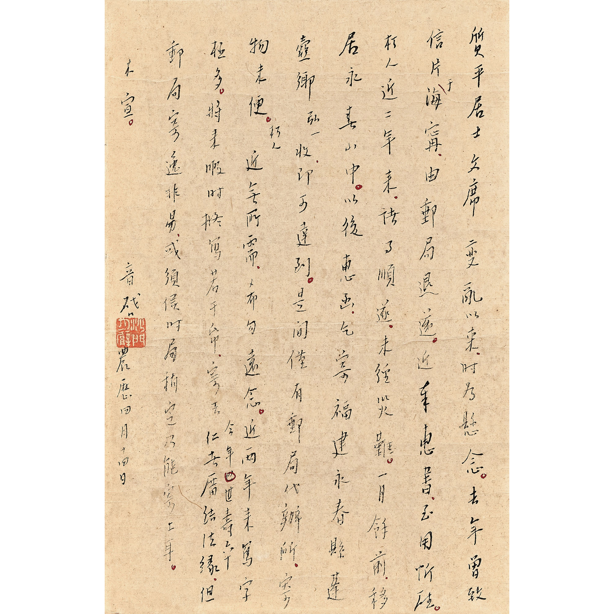 釋 文:質平居士文席:變亂以來,時為懸念,七年曾致信片於海寧,由郵局退遞,近奉惠書,至用忻慰,朽人近二年來,諸事順遂,未經災難,一月餘前,移居永春山中,以後惠函乞寄福建永春縣蓬湖鄉弘一,收即可達到,是間僅有郵局代辦所,寄物未便,朽人近無所需,希勿遠念,近兩年來寫字極多,將來暇時擬寫若干于紙寄去。今年世壽六十,仁者厝結法緣,但郵局寄逸非易,或須候時局稍定乃能寄上耳。不宣,音啟。農曆四月十四日。