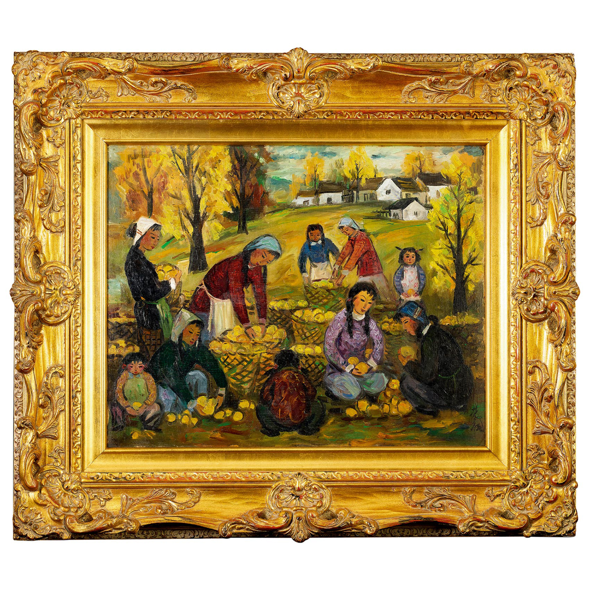 說 明:此幅《豐收》乃林風眠難得一見的中西合璧油畫傑作,力求運用中國傳統的繪畫手法與西方印象派色彩和構圖形式相融合,創造對美和生命活力的向往。觀之此畫,整幅洋溢著色彩的旋律。畫中數名村婦與孩童裝簍果實,村婦或蹲或立,頭戴巾帽,神情專注,身上各式花紋的樸實衣著、黝黑的皮膚,一旁的孩童或嬉戲、或協助工作,無不顯示出農人們辛勤勞作的特質。畫面樸實之中,穿透出農家勞動歡樂的滿足愉悅。整幅構圖疏密結合,用色溫厚而有層次。大面積的使用黃色使得畫面顯得秋意濃厚,遠處幾幢白牆黑瓦,以及上空的藍天白雲,展現出讓人嚮往的鄉村面貌。
