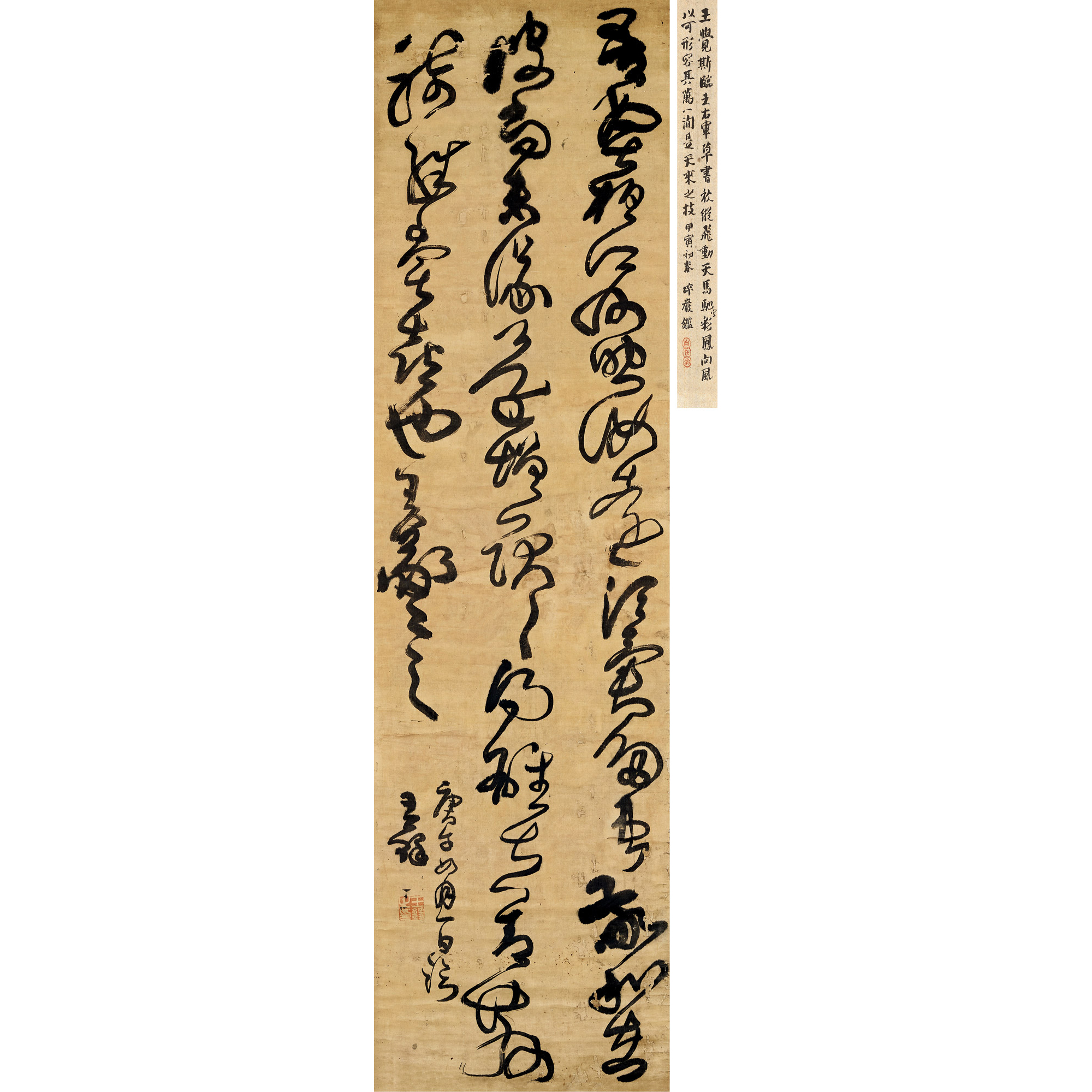 說 明:王鐸,晚明書法大家。其書法獨具特色,世稱“神筆王鐸”。他的書法與董其昌齊名,明末有“南董北王”之稱,他取法高古,與拘謹乏趣、滑弱無力的書風相抗衡,大膽創新,開創一代書風。王鐸學二王,師古而開新。縱觀此作,筆法大氣,勁健灑脫,淋漓痛快。用筆沈著富有變化,法度兼備。結構以奇險取勝,節奏強烈,極富感染力。有人以他的線條與明代另兩位草書家徐渭、祝枝山作比:則他的遒勁既有異於徐渭的粗放,也有別於祝枝山的生辣,至於文征明、董其昌則更不在話下。此外,他在結構處理上的構成意識也是前所未有的。空間的切割完全具有次序觀念,具有強有力的理性處置效果,不落俗套,出新意於法度之中,收奇效於意想之外。從此幅之中,能見得王氏用筆的潑辣,用墨的講究,可謂處處變化,處處精彩。