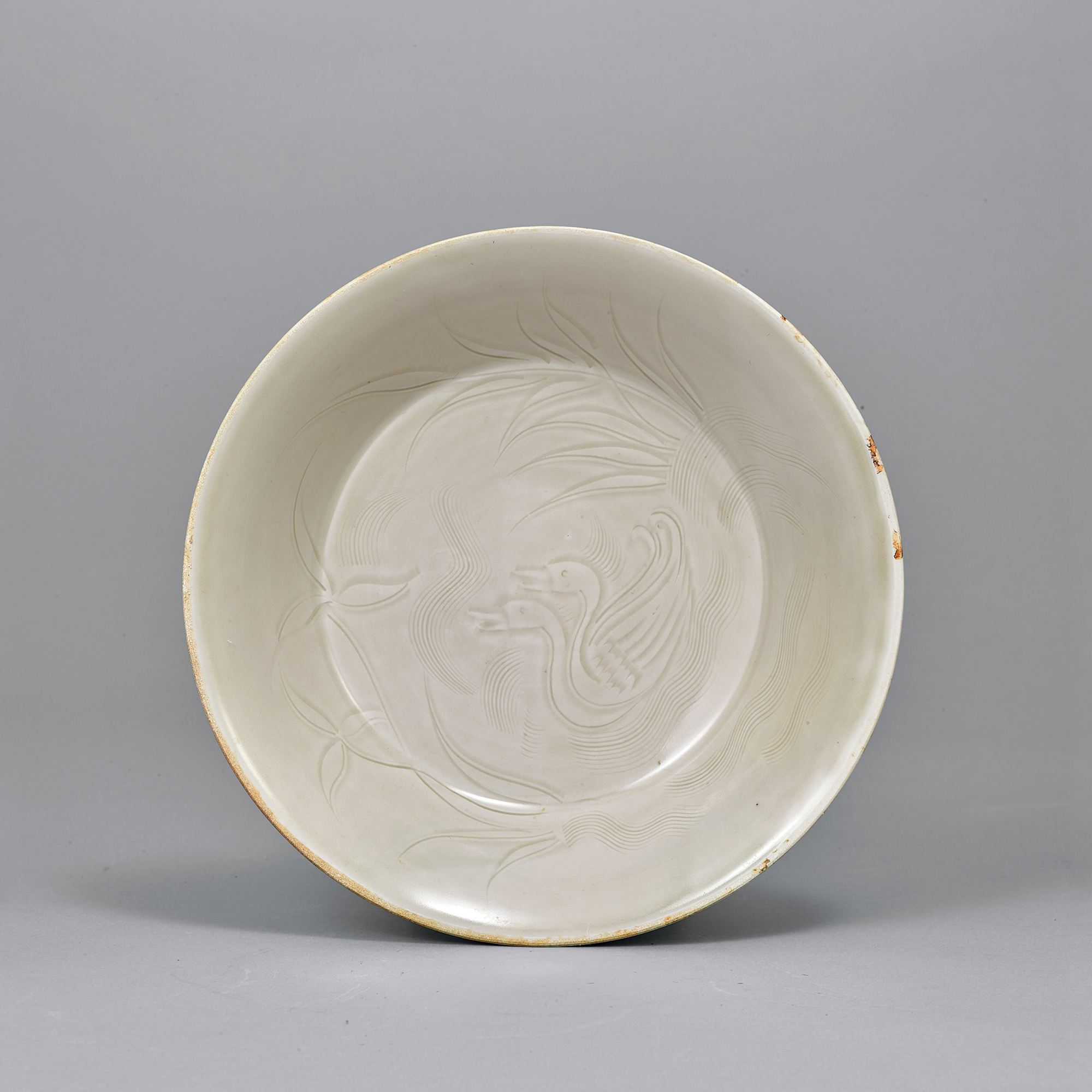 此件定窯白瓷劃花畫“荷塘雙鴨”紋盤為典型的宋代精品之作。其刻畫雙鴨圖,鴨紋生動傳神,栩栩如生。雙鴨戲水,蘆葦隨風飄逸,雖寥寥數筆,卻簡繁得當,雙鴨刻畫的極其細膩,輕盈的浮在水上,有呼之欲出之勢。寬刃的雕刀作斜刀與回鋒變化,快速的呈現畫筆提捺勾描般的線條;又善於利用梳箆般的多岔工具,在主紋飾間劃出平行流暢的複數線條,增加花葉的豐滿,或水波的流動。是一件不可多得的定窯佳品。