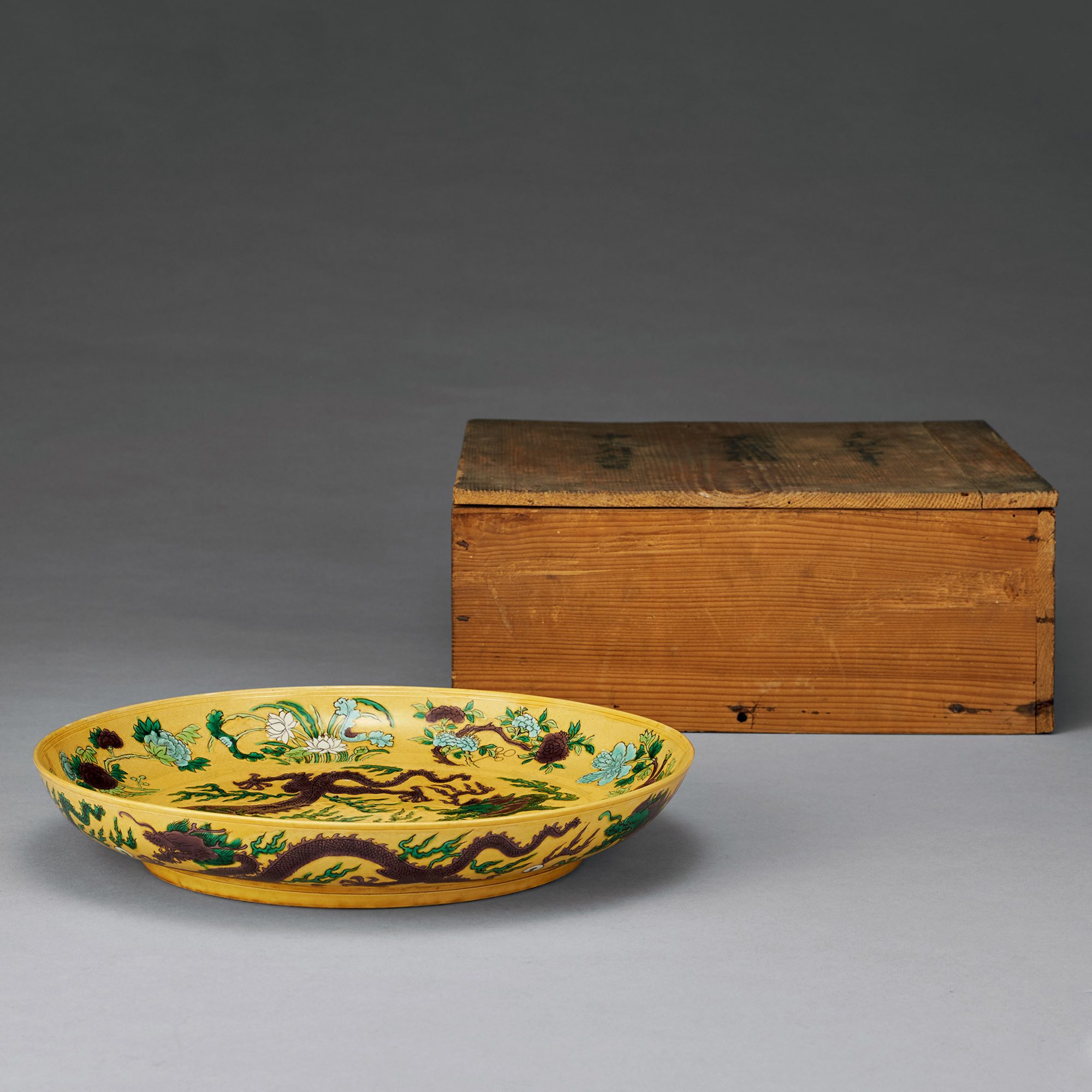 此盤敞口,弧壁,淺腹,廣底,圈足。全器以素三彩為工藝燒製,通體施黃釉,盤內壁用綠彩,紫彩,白彩等繪折枝四季花卉紋,盤心繪雙龍攆珠紋,外壁亦繪趕珠龍紋,足內施白釉,上有青花楷書“大清康熙年製”雙圈六字款。