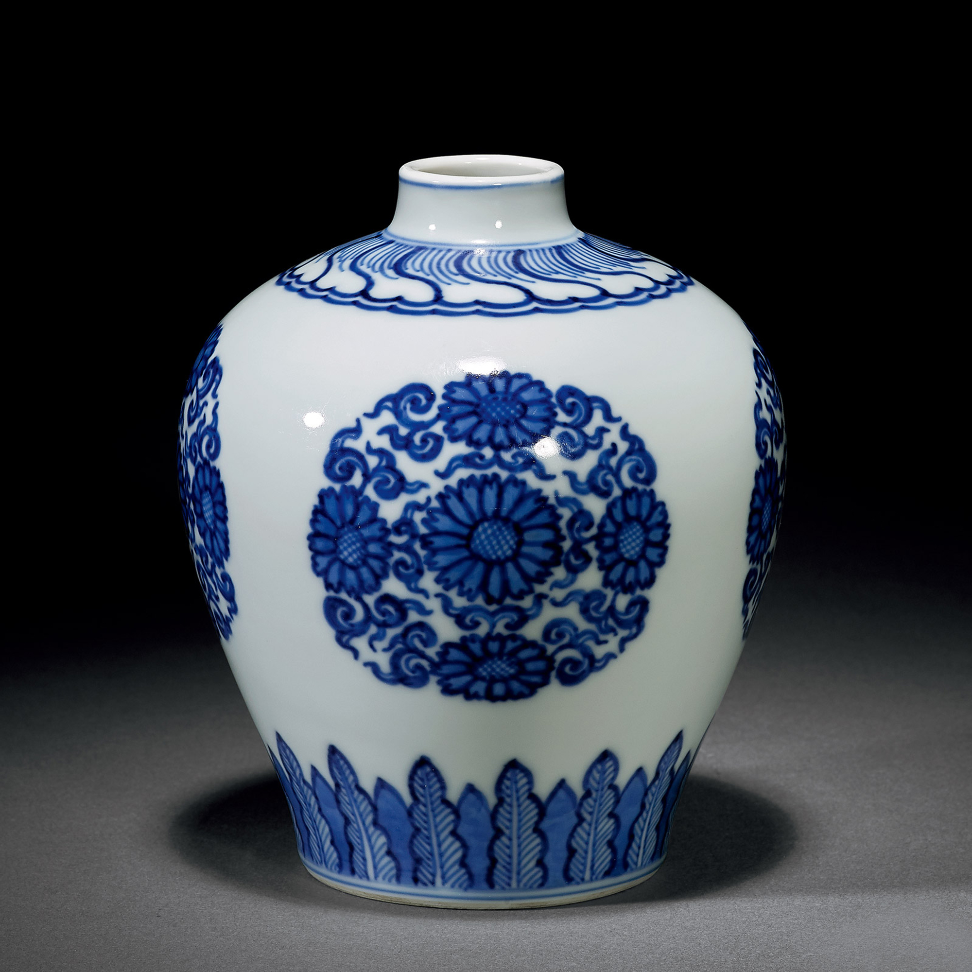 此罐直口,豐肩,收腹,下設圈足。器施白地青花釉,肩部繪卷浪紋,底足部繪蕉葉紋,中間繪團菊紋,淺圈足,足內楷書“大清雍正年製”雙圈款。罐之底釉潔白清亮,青花深藍艷麗,發色色調深沈,有仿嘉靖青花之韻味,整體紋飾線條規範周正,極為嚴謹,素雅卻又凸顯高貴,乃雍正官窯之稀有傳世器物。