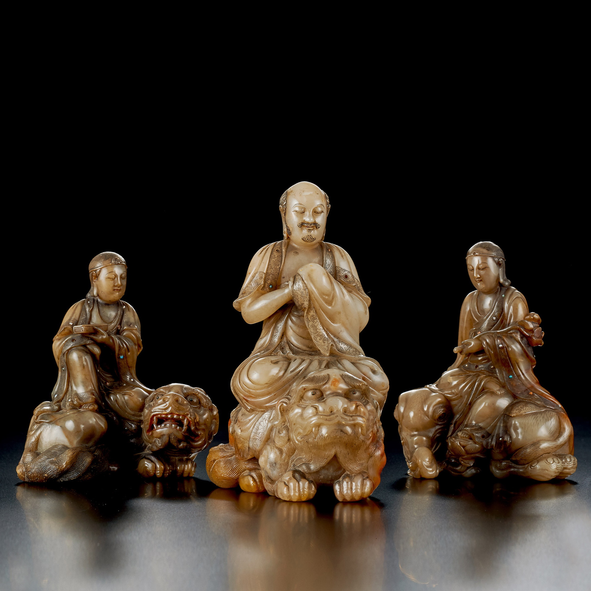 玉璇傳世真品極為稀少,就目前故宮博物院及民間留存的精品來看,將人物與坐騎連體圓雕的作品,更是罕見,令人耳目一新,為之一怔。本三件作品石質氣息相同,雕法一致,精工藝絕,神情並茂,類比故宮及民間流傳“玉璇”之作品的雕刻技法,有過之而無不及,故此組造像為玉璇之作無疑。三尊造像比例協調,法相極為莊嚴,另外衣衫上嵌綠松石,紅瑪瑙,珊瑚等各式寶石,使得造像雍容華貴,極富皇家之氣,或為玉璇供職於造辦處時之作。
