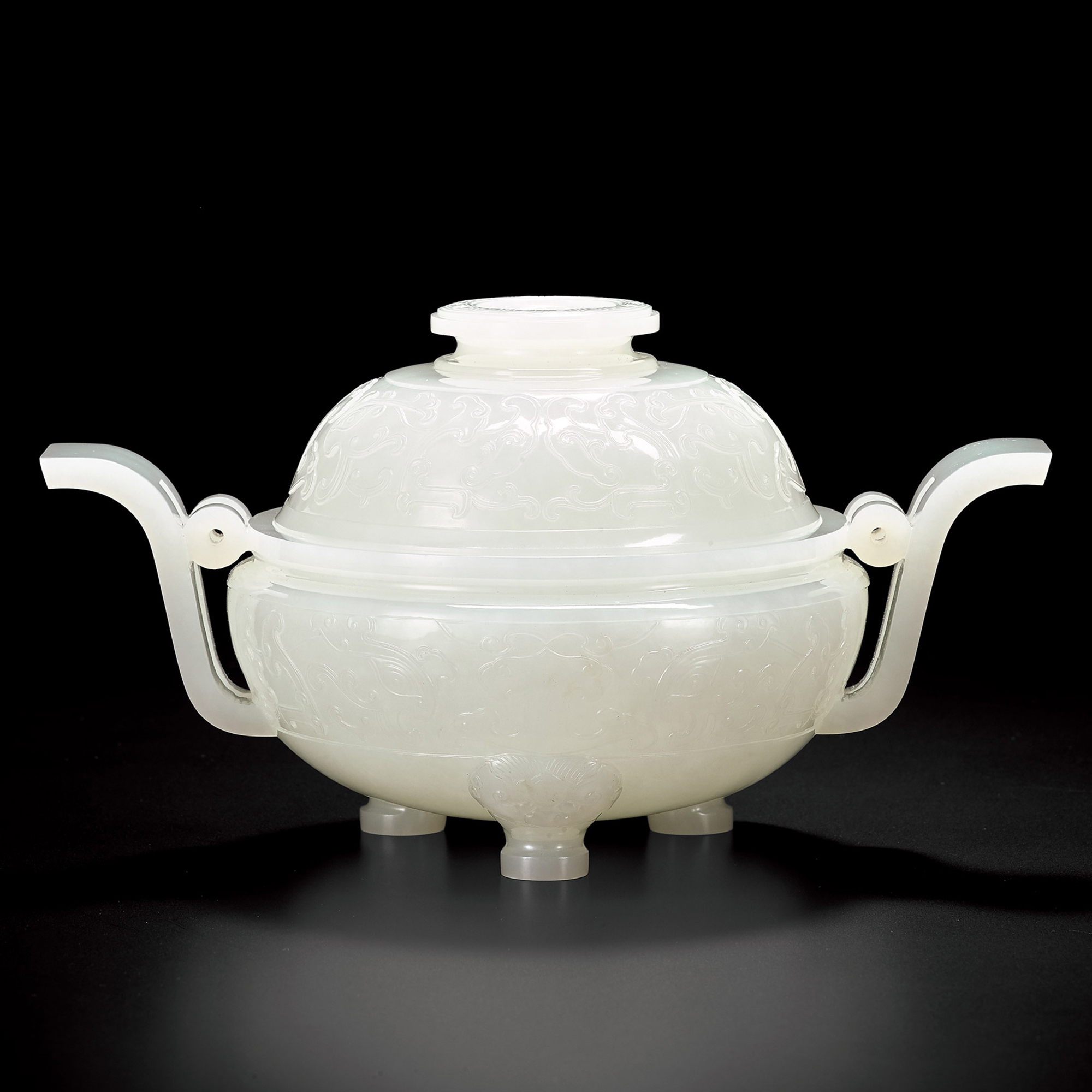 蓋爐爲清代皇家及士大夫的書房常備之物。乾隆皇帝熟通漢理,精于儒典,乃一代文雅之帝,屋內焚香亦不可少。玉爐飄香,一室皆淨。本品采用和田白玉上上之料,取古樸厚重之吉金造型,處處彰顯出古雅樸拙的唯美,構思巧妙,刀工細膩流暢,仿古卻不同于古,具有典型乾隆期仿古玉器的意蘊,于富麗中增添古雅之姿,實爲精彩,爲不可多得的玉雕珍品。