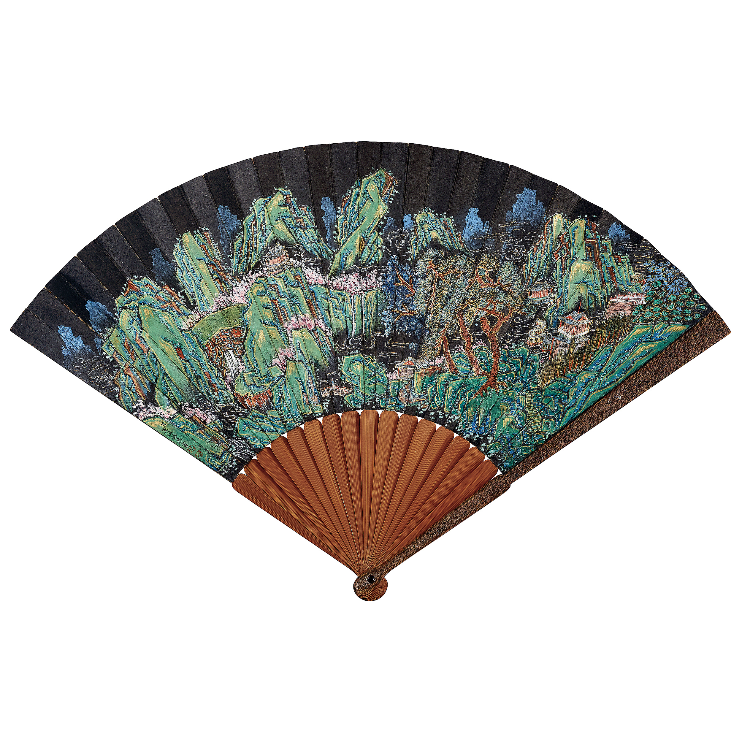 說明:此成扇在黑地上畫青綠山水,華麗非常,用色、畫工俱極講究,歷來山水顏料俱用巖石色,價極昂,非普通人能用,好顏料歷久不舊,且此扇骨材質、雕工極精致。落款雲:臣某某恭畫。典型的宮廷畫家為王公所繪之款。為王公畫畫,必須嚴謹精細,一絲不茍,以至於畫面有拘速氣,畫面又不失廟堂氣,從諸證可知此乃宮廷畫作無疑。作者簡介:王敬銘 字丹思,號味閑。自幼就喜愛文學,尤嗜詩詞書畫。1707年,康熙皇帝南巡,39歲的王敬銘呈獻詩、畫,極受康熙皇帝的賞識,他被補召入皇宮暢春園內,充當武英殿的纂修官。