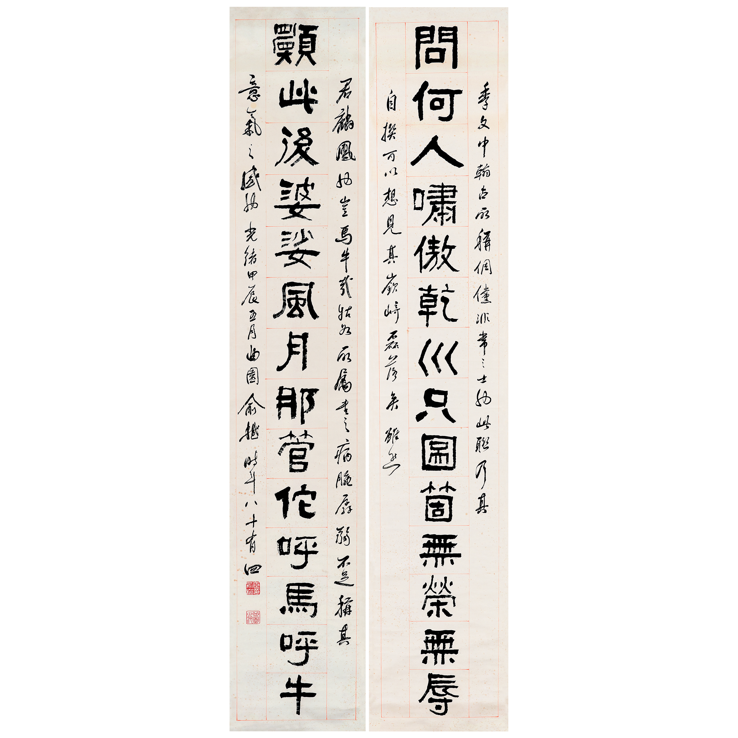 款識:季文中翰古所稱倜儻非常之士也,此聯乃其自撰,可以想見其嶔崎磊落矣,雖然君麟鳳也,豈馬牛哉,姑如所屬書之。病腕孱弱不足稱其意氣之感也。光緒甲辰五月曲園俞樾時年八十有四。