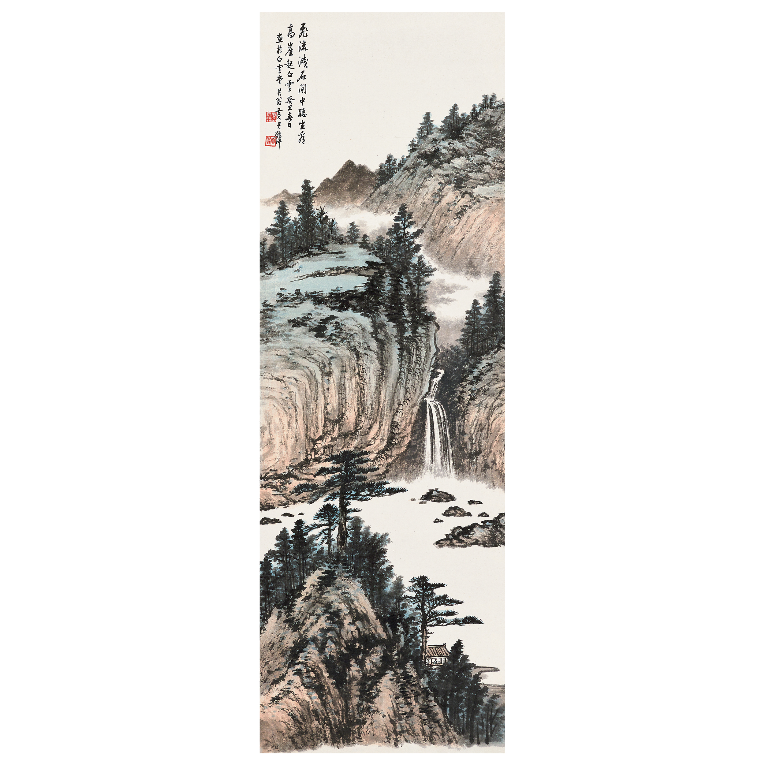 款識:飛流濺石閑中聽,坐看高崖起白雲。癸丑春日,畫於白雲堂,君翁黃君璧。