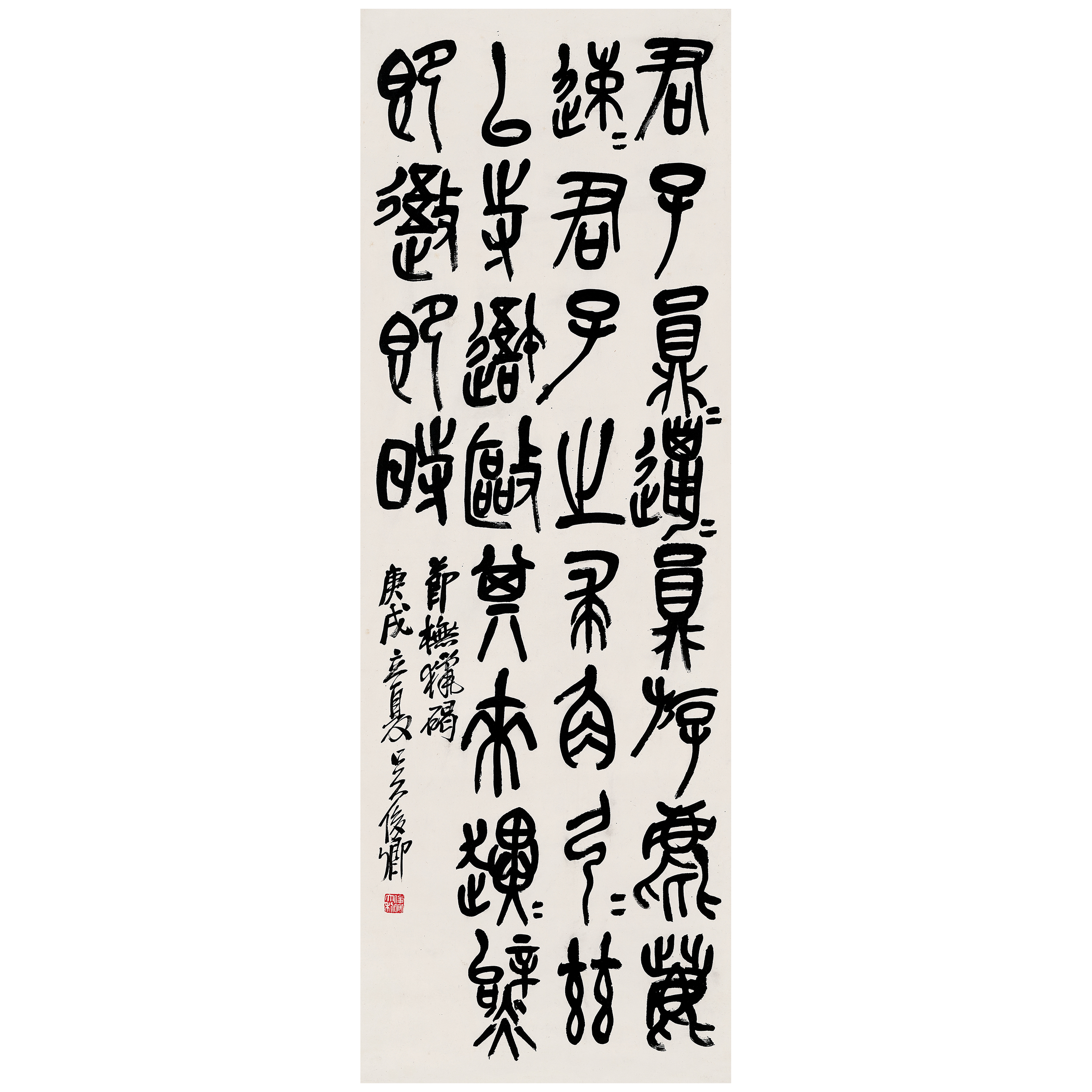 說明:昌碩早期篆書師法楊沂孫,用筆、神氣都學得很到位,楊沂孫是當時的篆書大家,吳昌碩師法當是自然,後來吳昌碩深知自己取法不高,居心求變,於是在石鼓文中下功夫,於是便有此類拙味極盛的臨作面世,雖說是臨,其實很大程度上已經是另外一種創作了。晚清,金石考據之學日盛,而書壇篆隸之風亦日盛,晚晴至民國,篆隸書家名家輩出,其中,吳昌碩是不能繞過的一座高峰。吳昌碩寫石鼓文。其勢縱橫開闔,不減萬馬千軍作也不面對精鋼,老吳可以繞指柔,又能將朽木鍛成鐵枝,幻化有無之中,且神氣活現,獨開千古,真有關羽守華容之氣魄,只能驚歎妙絕。此作極高古、深沉,筆筆中鋒,力透紙背,笨拙中又不失靈動,可謂氣追太華,上衝牛斗。