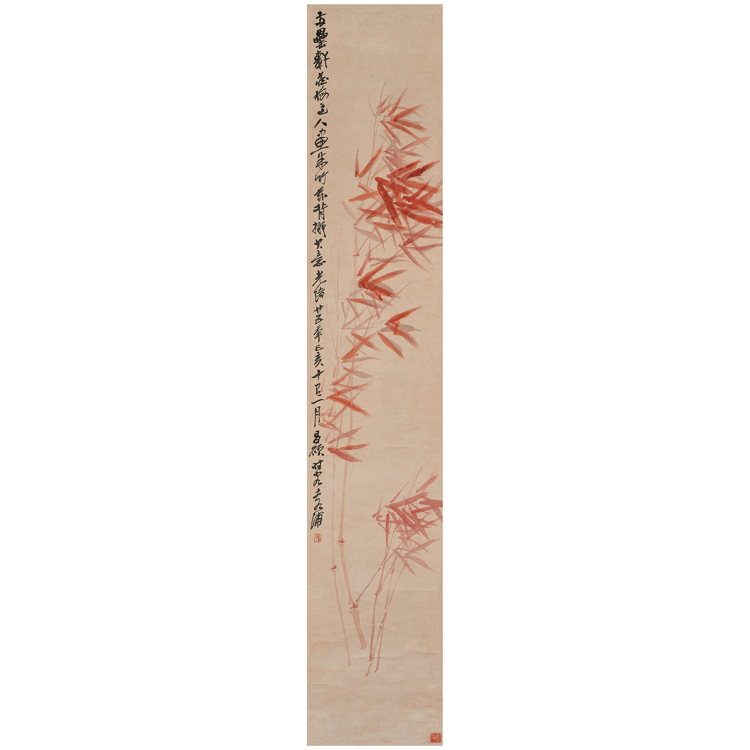 款識:兩罍軒藏梅道人畫朱竹,茲背擬其意。光緒廿五年,己亥十有一月。昌碩時客袁浦。
