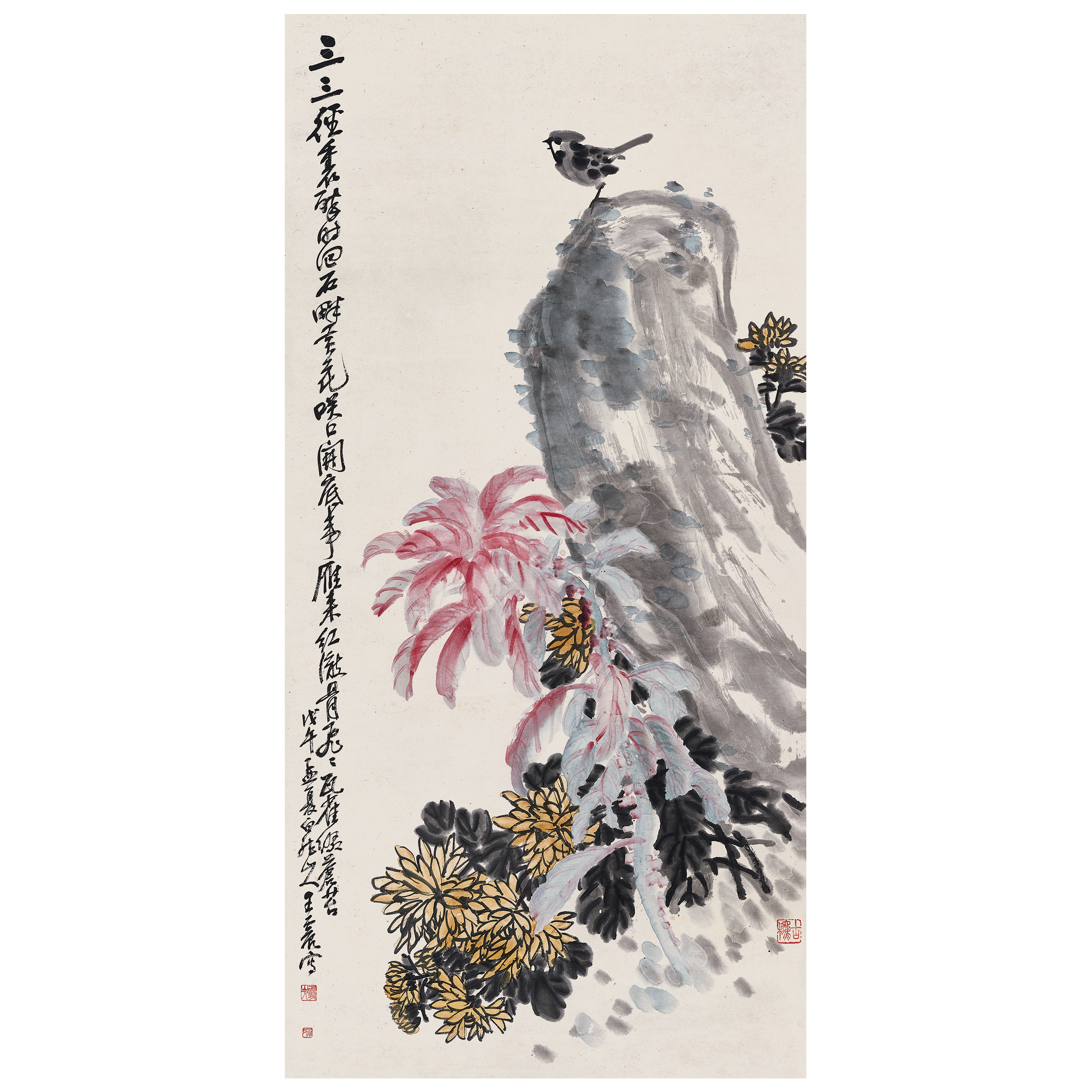 說明:王震與吳昌碩亦師亦友,書畫修養上更多是師承關係,他很好的繼承和發展了海派吳門這一路樸實無華,筆力沉穩的風格。從此圖中的用筆、用線便可看出王一亭受吳昌碩的影響之深。而在吳昌碩的基礎上,王一亭更加生拙、樸實。石頭、花草渾厚古樸,立鳥生動活潑。王一亭是當時上海大實業家、大慈善家,以此身份能于書畫有此成就,實屬難得。全畫用筆厚重,構圖平實,於平常處求不平常,彰顯功力,不以奇特個性搶人眼球,可謂大家手筆,下筆便見水準。
