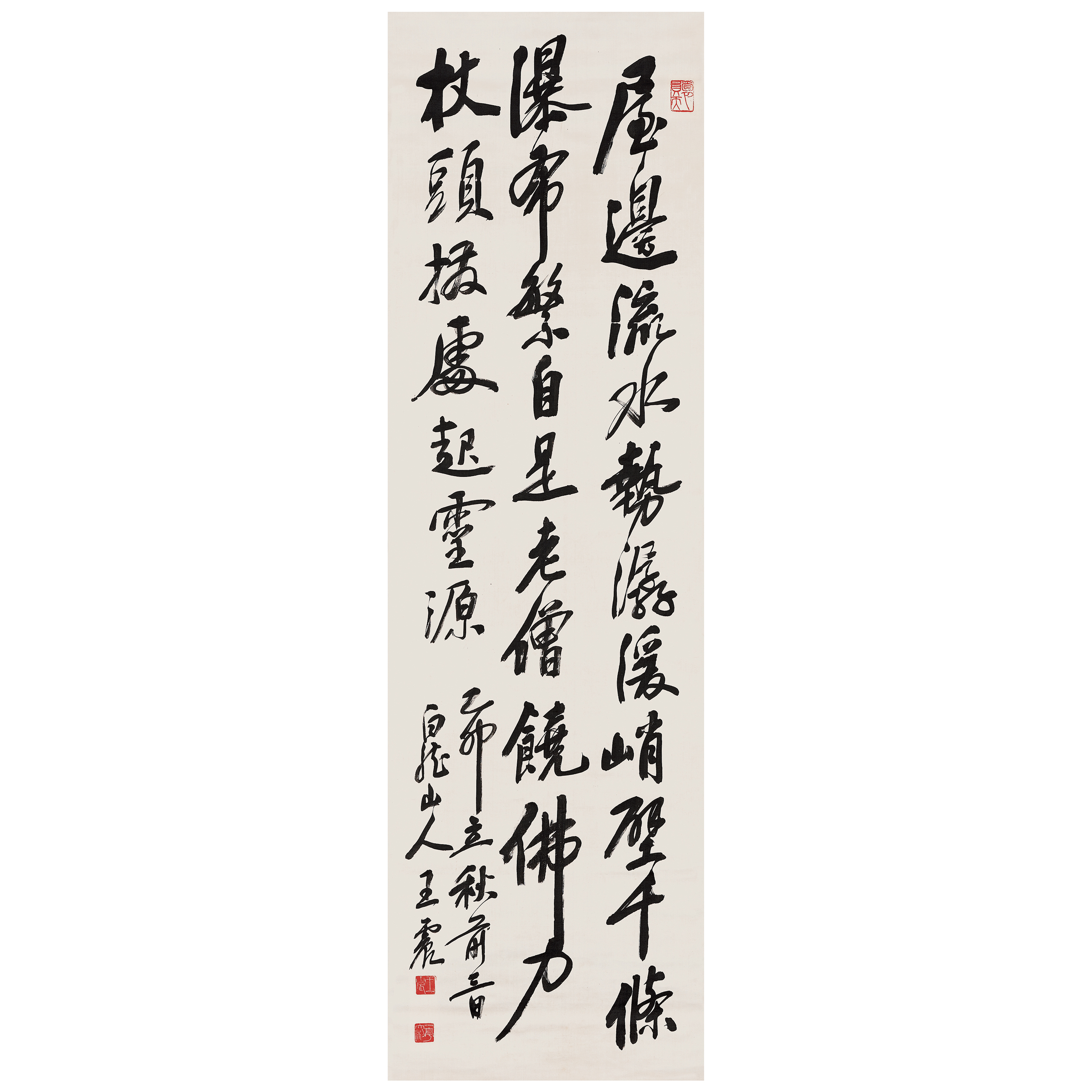 釋文:屋邊流水勢潺緩,峭壁千條瀑布繁,自是老僧饒佛力,杖頭撥處起靈源。