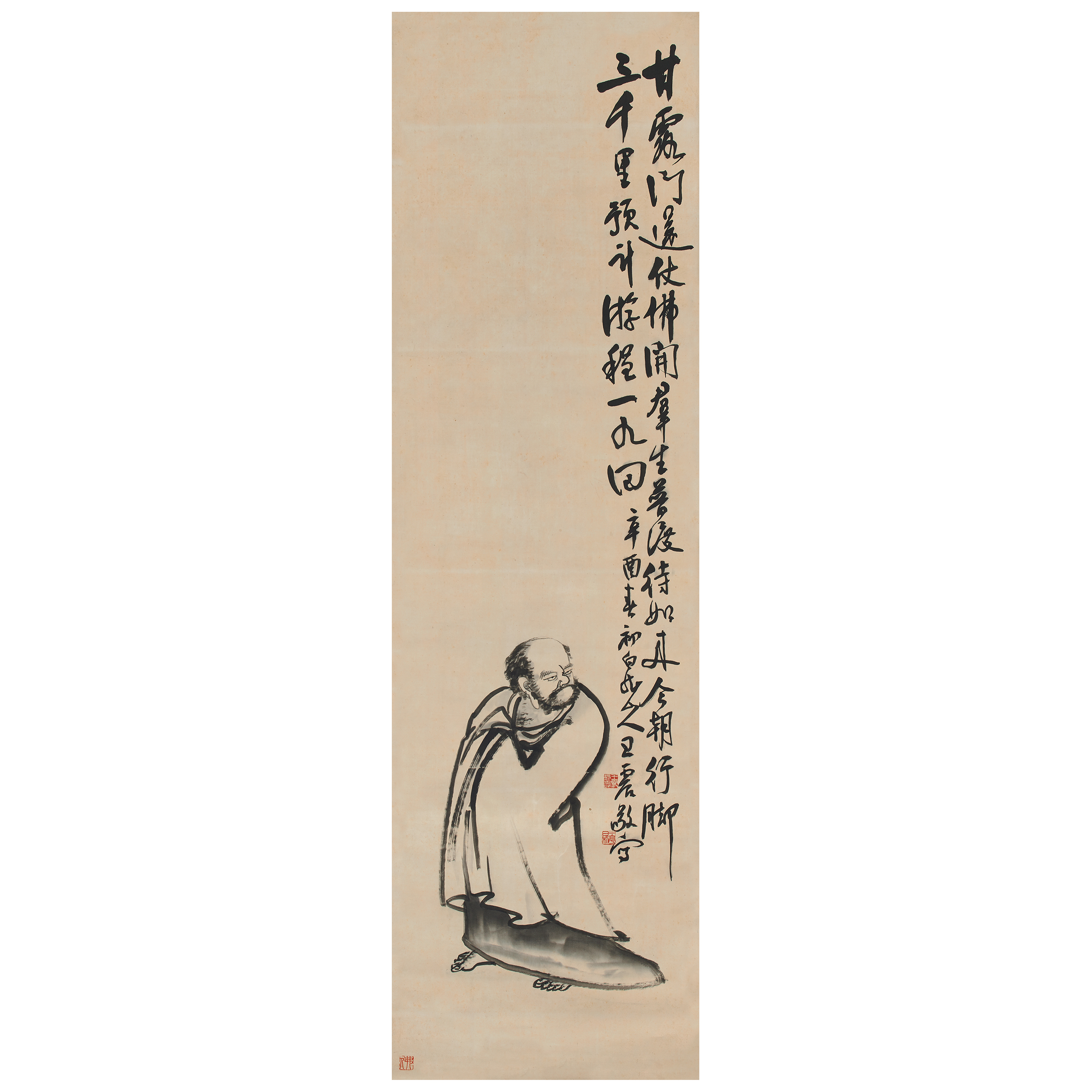 款識:甘露門還仗佛開,群生普渡待如來,今朝行腳三千里,預計遊程一九回。辛酉春初,白龍山人王震敬寫。