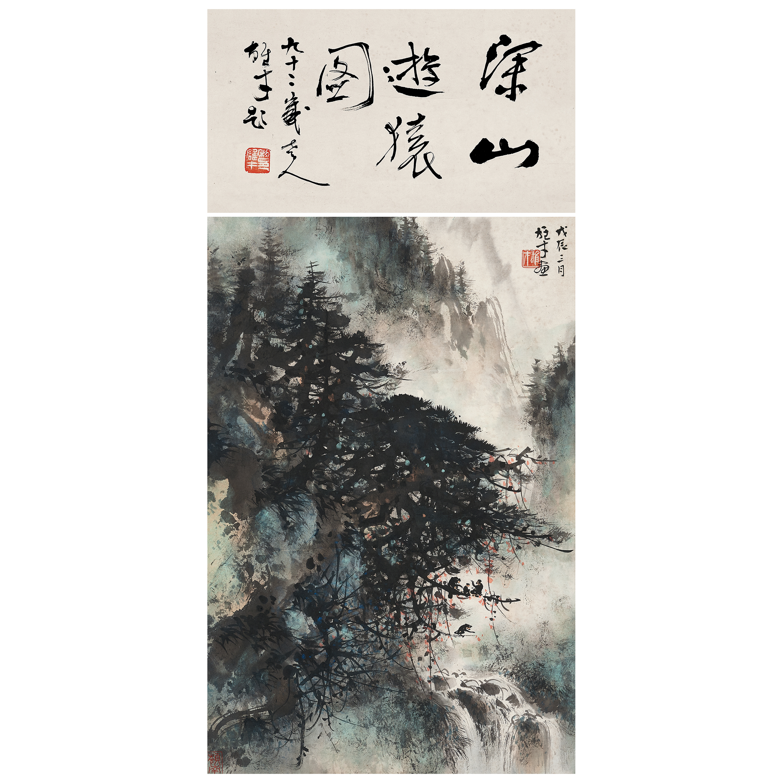 詩塘:深山游猿圖。九十二歲老人雄才題。鈐印:黎雄才印(白)