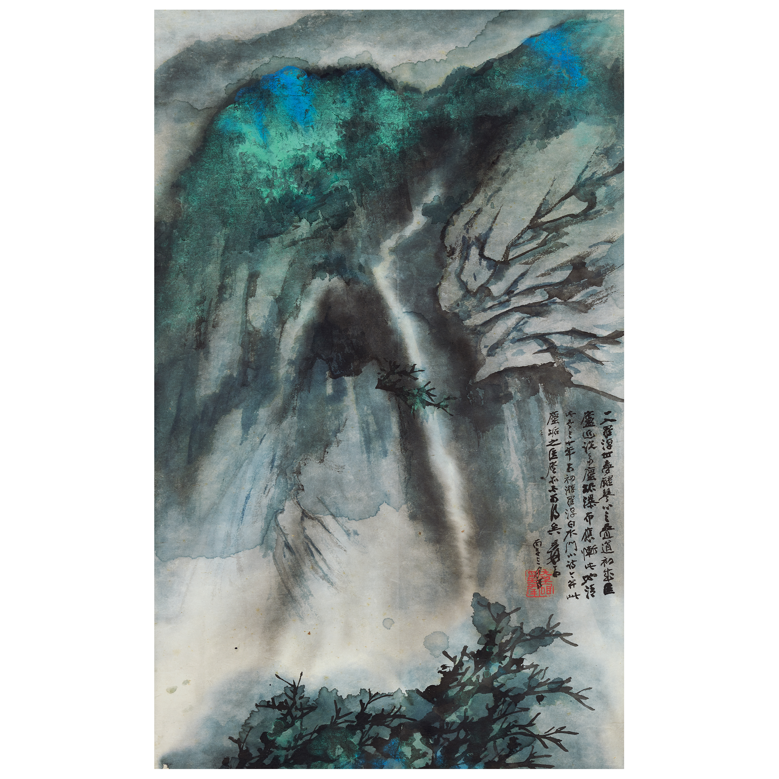 六十年代中期,大千歐遊歸來,將歐陸所見山林風貌的奇光煥彩與鑽研敦煌壁畫的斑爛重彩融合,開創了大千藝術成就上的最後一波高峰——“潑彩山水”。是幅作品正是創作於此階段,潑彩技法已日益成熟,對色彩的把握亦極為精準。是幅山水以全景式構圖,潑墨與潑彩並用,表現出氣勢磅礴的崇山流瀑之景。整幅作品水氣氤氳,濃郁深邃,墨色交融,元氣淋漓,顯示出張大千對水分與墨色極高的把控能力。最引人矚目的是,峰頂的那一抹明亮的石青,於沉郁的墨色中積澱、擴散,幽玄斑斕,散發出迷人的色彩,沁入人心。只見自山峰處,一股宏大的瀑布沖入水潭,將濃黑的山體劈開兩半,於余白中漸隱,仿佛化入水氣之中。山底以淡青色過渡,用中國畫筆韻畫出的樹木,虽只露一角,更凸顯山之高耸。只見大千題詩云:“一入羅浮世夢醒,琴心三疊道初成,匡廬近說多塵垢,瀑布應慚此地清”,這是一首張大千於三十年前初遊羅浮白水門所作的小詩,畫家巧妙的將自己的意境下筆為圖,實在妙哉。