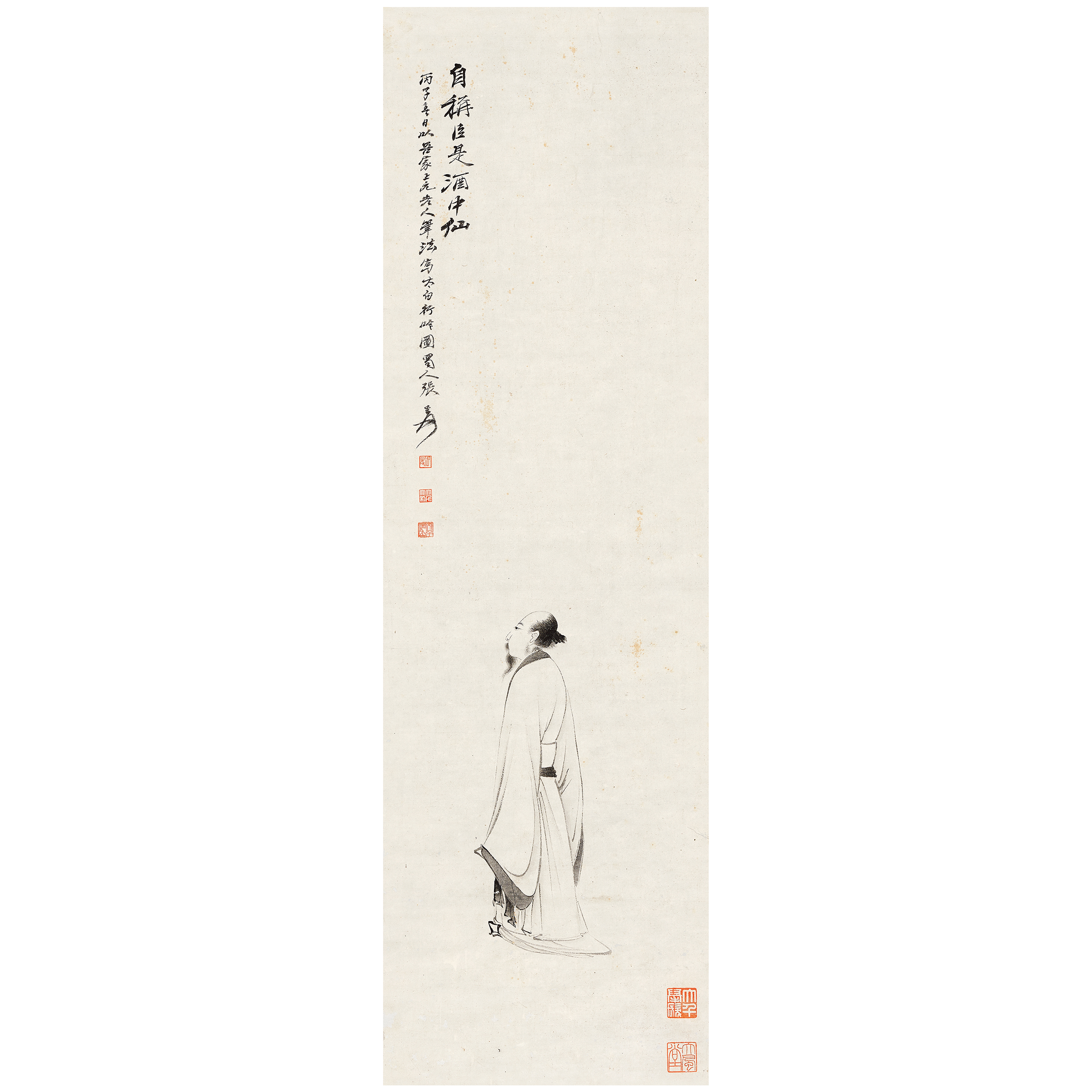 說明:張大千喜好以高士為題材進行創作,將高逸之士以概念化的形象置於山水林泉之間。象征士大夫歸隱後的生活,同時抒發希冀縱情於物的情致。是幅《太白行吟圖》取自李白“月下獨酌”之典故,高士仰面蒼天,似若詩情滿懷,縱思運句,可以看作是大千作為一個入世畫家,超凡遁世的自我寫照。張大千是文士,出世入世,俱是能事,其志在四海而行無蹤影,筆底往往有神出鬼沒之意,遊戲筆墨,堪稱一絕。是幅高士將文人之思訴諸筆端,人物古意盎然,筆墨洗練,傳神生動,高士襟袖飄逸,猶如風中獨立,令人不禁折服於其筆下人物清麗雅逸的名士風度。