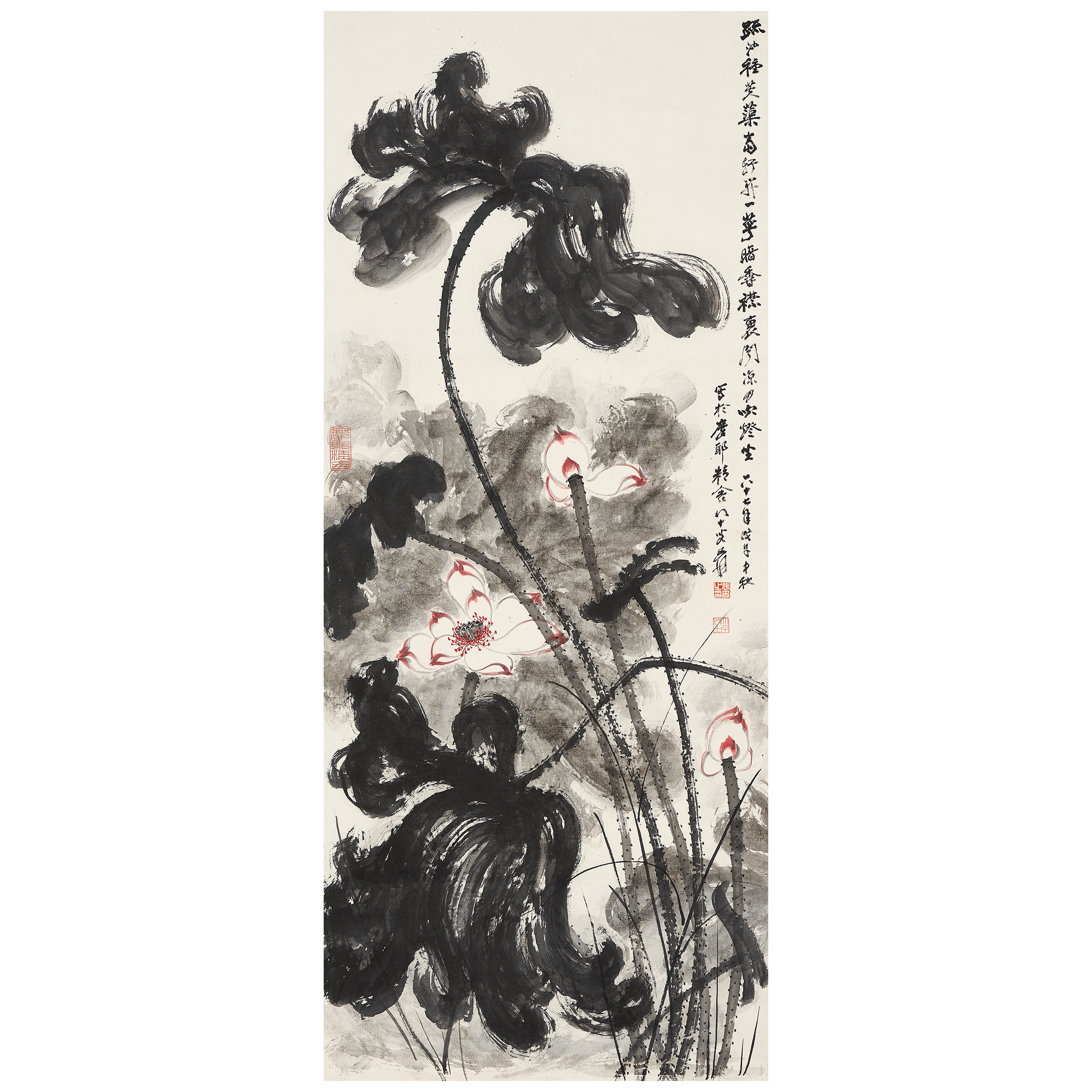 說明:張大千筆下的荷花均是落落大方,雅俗共賞,嬌艷而不俗,沉著而不浮,生動而不匠。是幅荷花圖作於1978年,正是張大千畫荷進入化境後的代表作。張大千在此這一時期,的荷花圖注意了畫與書法之間的關係,真正體現了其篆書筆法畫荷干、隸書筆法畫荷葉、楷書筆法畫荷瓣的風格。張大千畫荷初學石濤,在淡墨之後,在辦尖上用濃墨破之,使荷花既精神又嬌嫩、水靈,這種畫法運用在晚年更為自如,花瓣線條的勾勒也更加流暢而靈動。是幅荷花,大筆縱逸,氣象瀟灑,堪稱大千晚年畫荷之精品。只見墨葉簇擁,玉荷盛放,迎風蕩漾,搖晃多姿,氣勢非凡。荷花線條靈動,神韻天成,在大片墨葉的映襯之下,更覺灼灼照眼,身潔如玉,出塵之致躍然紙上。畫上體詩“疏池種芙蕖,當軒開一萼,暗香襟裡聞,涼月吹燈坐”,詩畫合璧,更覺意境高妙。