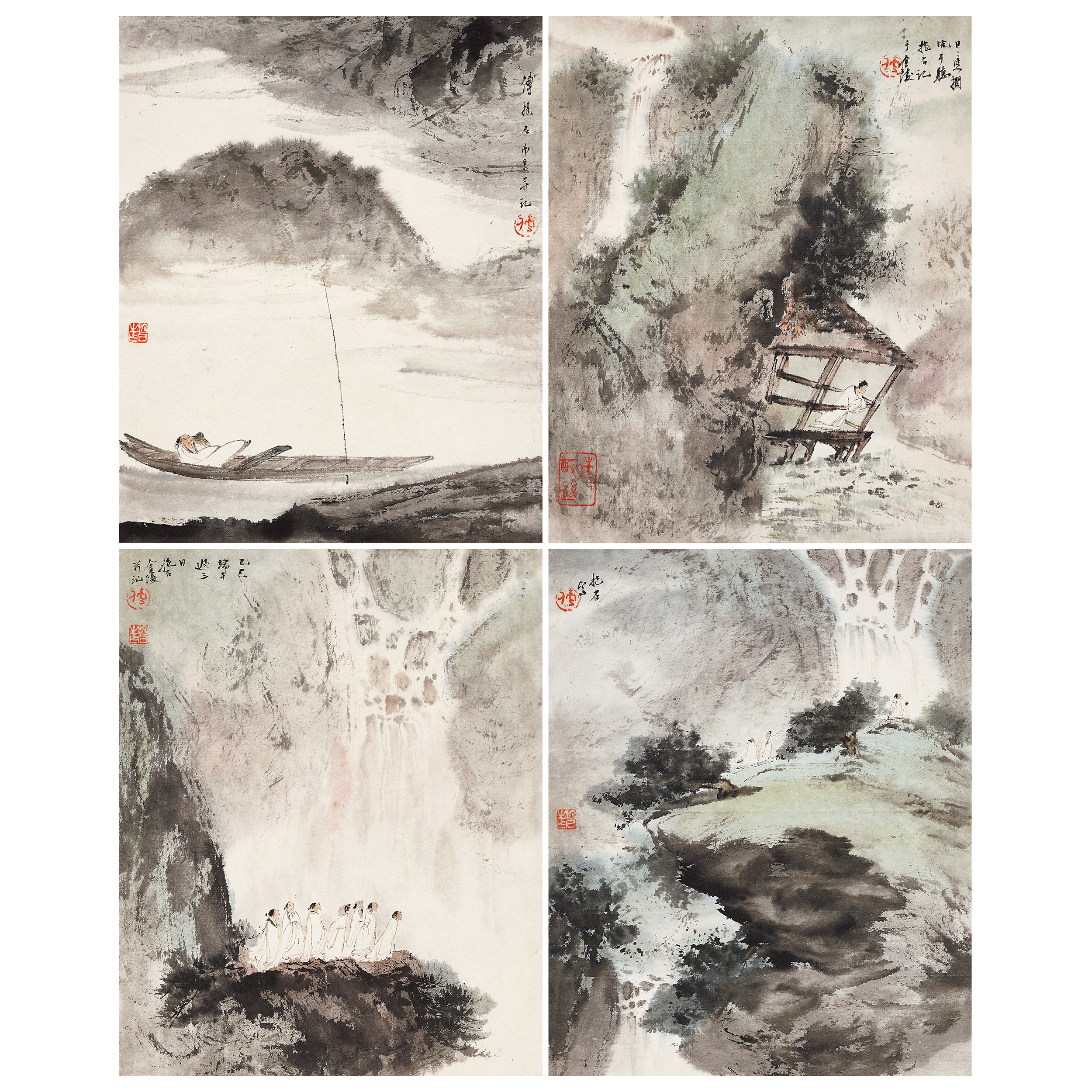 自1961年傅抱石遠赴東北采風,觀賞北方之河川,經醞釀與沉澱,可謂達到了對此題材演繹的全新境界。此四幅《高士山水》小品,均為傅抱石晚年的成熟之作,其中一幅成於1965年,是其藝術生涯的終年之作。以不同角度、構圖、手法,展現出高士聽瀑的不同意境,可謂集齊傅抱石畢生藝術之大成,代表了抱石山水畫創作的最高成就。