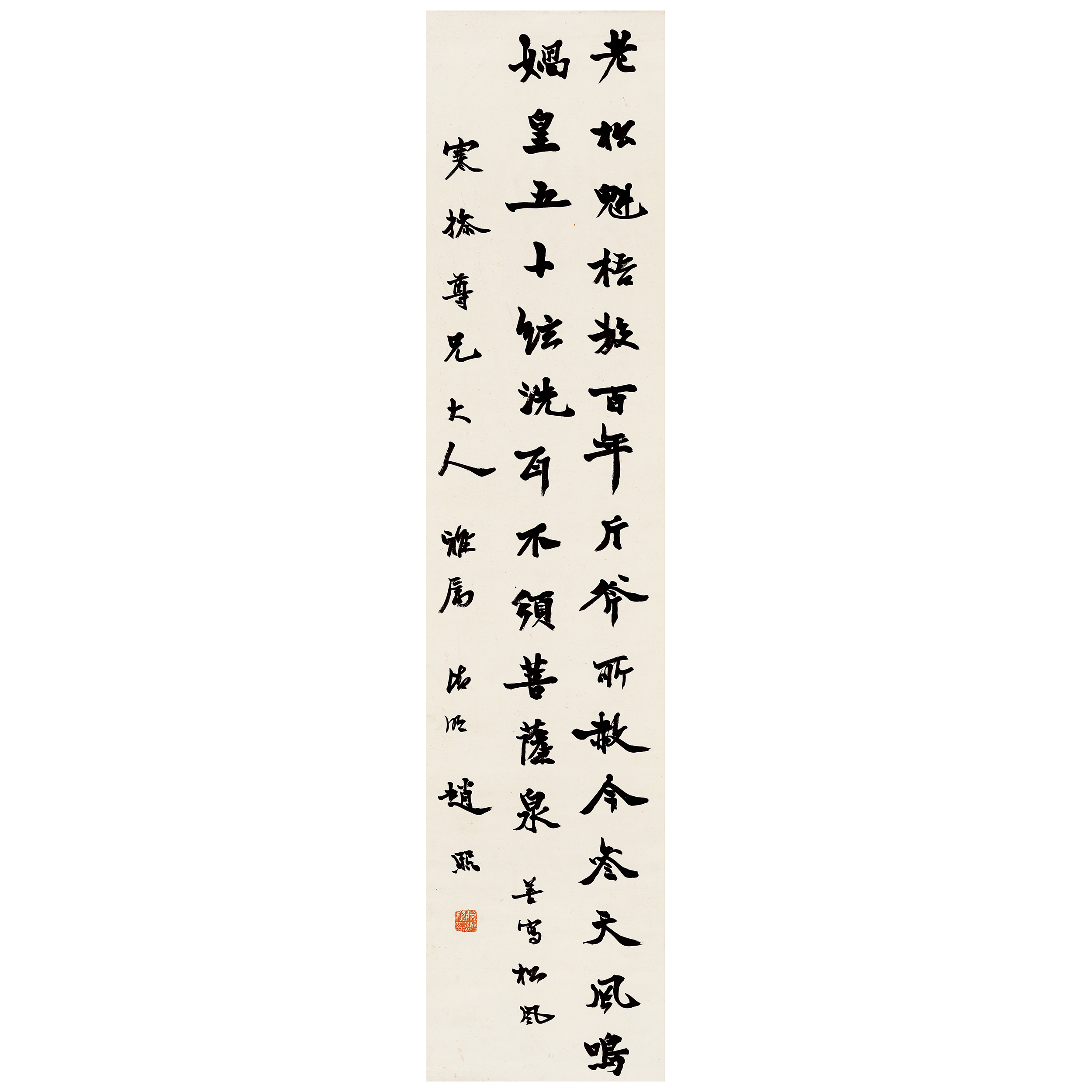 釋文:老松魁梧疑百年,斤斧所赦今參天,風鳴媧皇五十弦,洗耳不須菩薩泉。來源:日本書畫家髙橋廣峰同一舊藏。上款人:梁寒操(1899-1975),號君猷、均黙,原籍廣東省肇慶府高要縣,中華民國政治家、教育家、實業家。曾任國民黨中央常委、中央宣傳部部長等重要職務。工詩文、擅書法,有“高要才子”之稱。作者簡介:趙熙 字堯生,號香宋,四川榮縣人。清末民初翰林、學者、詩人、書畫家。蜀中五老七賢之一,世稱“晚清第一詞人”。他工詩,善書,間亦作畫。