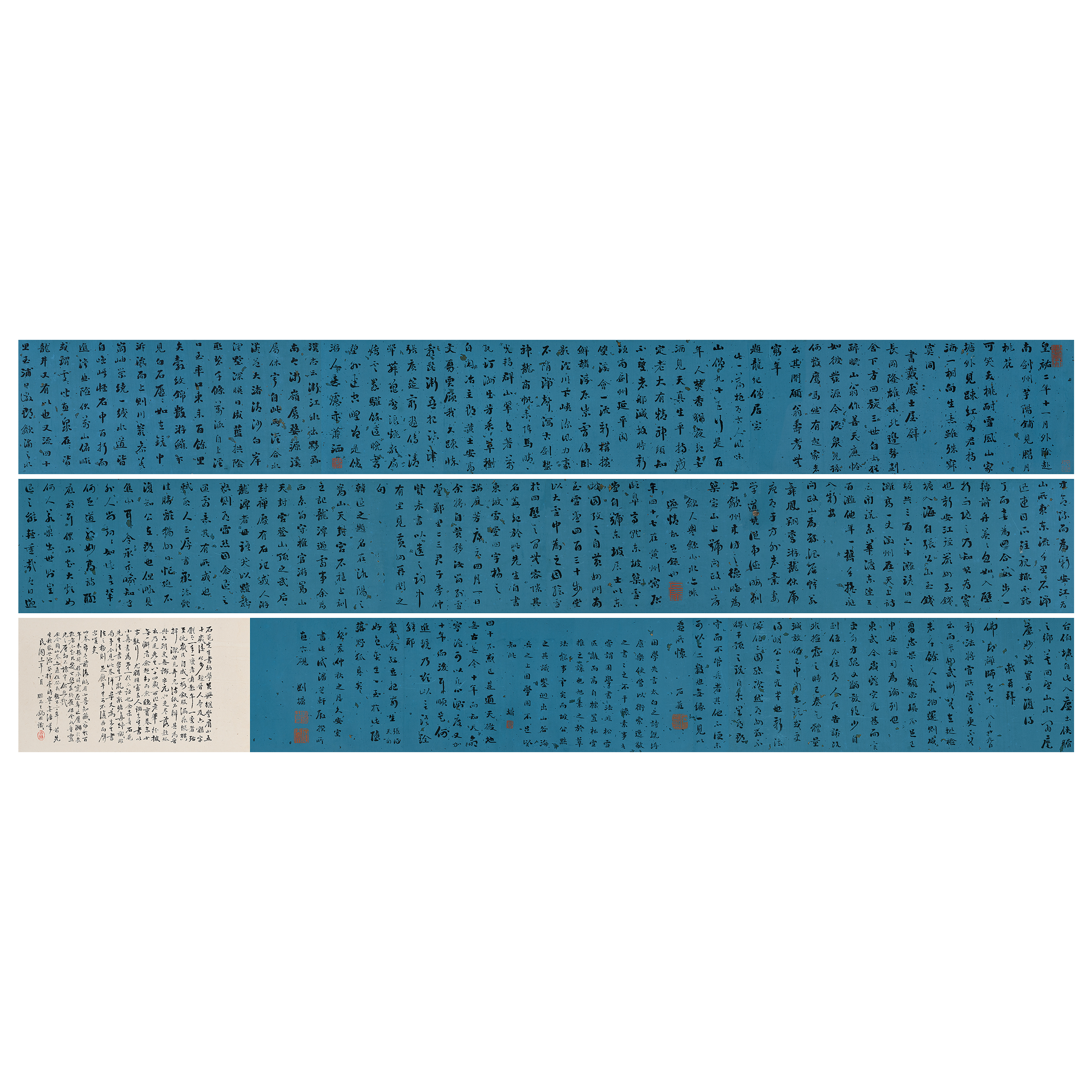 題跋:石庵先生書幼學吳興,繼學有山,五十歲後始步趨晉人,旁及六朝,字體有一年一變者,有數年一變者,殆至晚歲,乃自成一格,釵股漏痕,縱橫揮灑,但見奇光滿紙,不辨其為晉與六朝,更無論宋元也,是卷落款癸亥,乃是先生八十四歲所作,老筆紛披,無一懈者,愈超幻而愈穩實,卷末小字數行,尤稱精,審前人論,先生書以小真書為第一,信不誣也,余素喜石庵先生法書,然生丁亂無欲覩真跡,誠非易事,今見此卷,洋洋尋丈,為先生書法之極則,足慰平生,可不復再向壁空歎矣。此卷紙色前後略有小異,知藏家於百年來輾轉傳承,時竄逐奔亡,屢瀕於喪亂者不知凡幾也,然能終獲保全如魯靈光之歷劫不壞,豈偶然哉。餘今題此卷亦適值癸亥,想百二十年前先生于盛世濡墨揮毫時寧無浩歎,民國十二年八月,膠西王錫朋識。鈐印:古稀(朱)