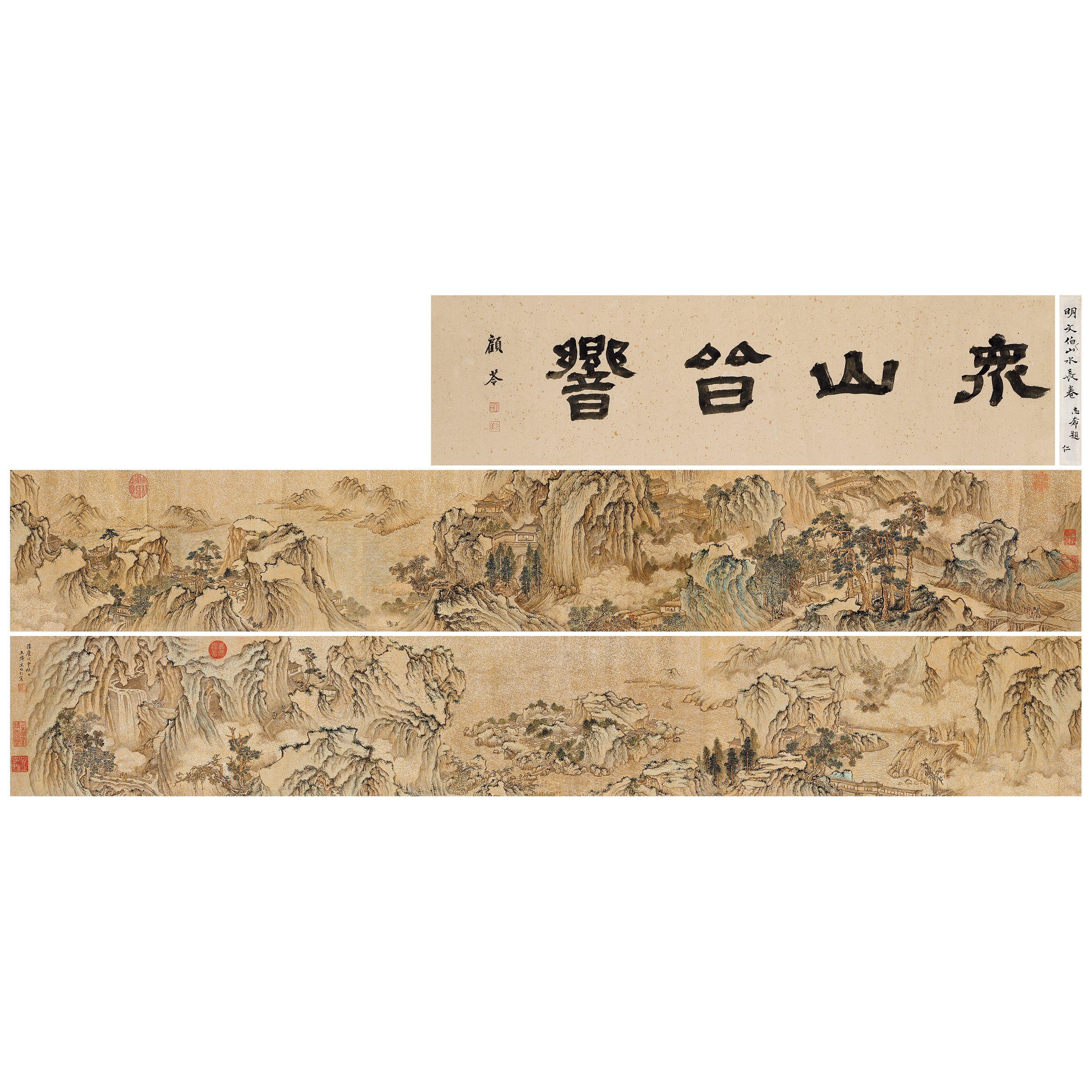 明文伯仁畫山水一卷,本幅金箋本,縱九寸橫一丈一尺六寸七分,設色。畫群峰斷續,雲氣往來,岩剎相望,風檣浩渺,款隆慶戊申秋日,五峰文伯仁寫。鈐印一:五峰。引首,眾山皆響(隸書),顧苓鈐印二:顧苓、雲美。鑒藏寶璽:全五璽。寳笈三編。