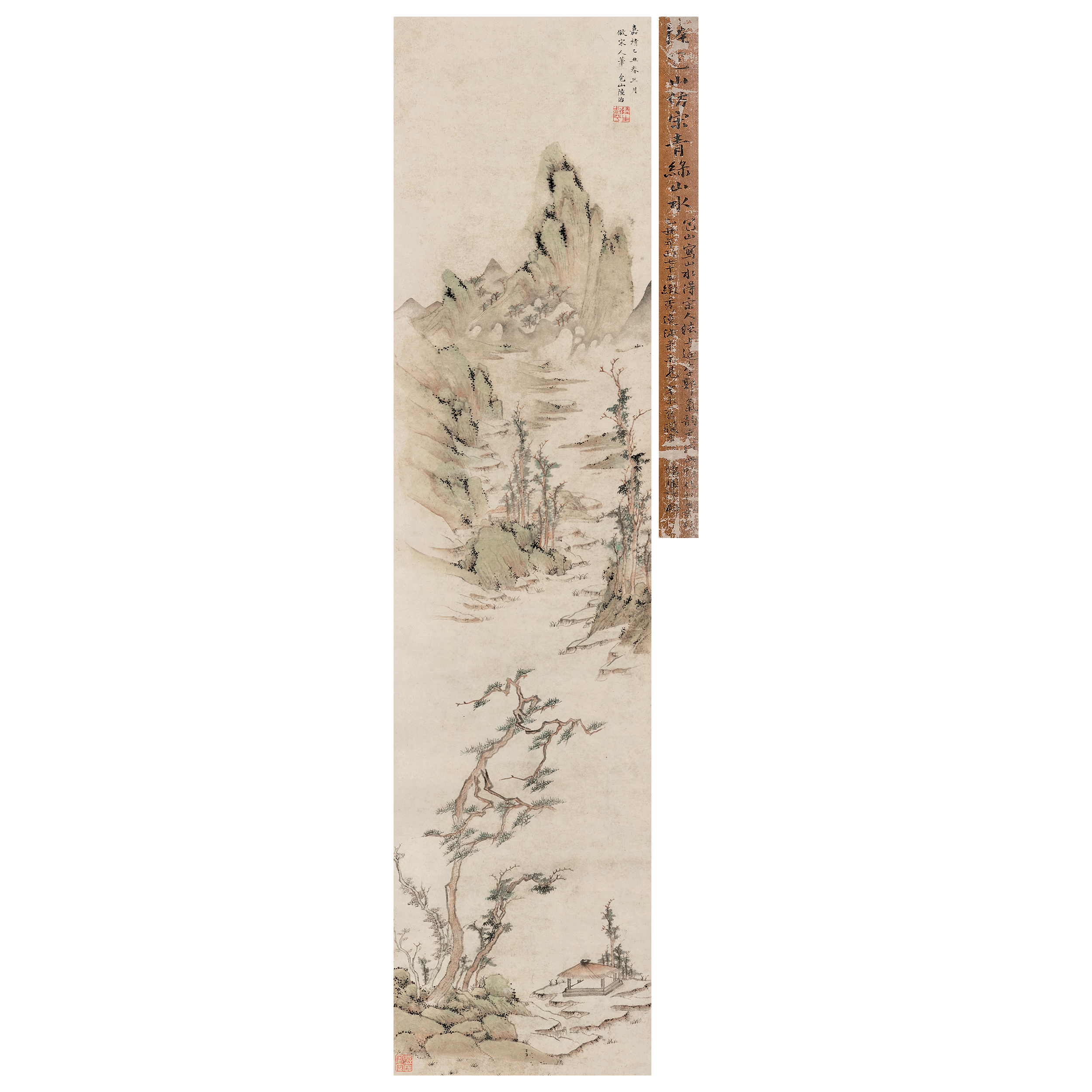 藏印:嚴氏審定(白)題簽:陸包山仿宋青綠山水。包山寫山水得宋人法,上逼李郭,氣韻天成,此幀作於嘉靖乙丑年,政七十,工致秀逸,從來未見,辛未舊臘□□□□□□。