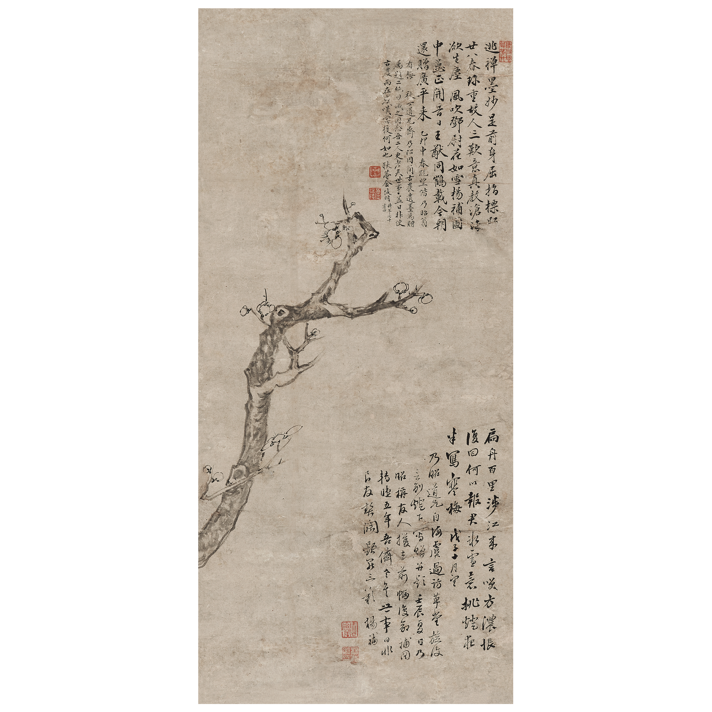 題跋:乙卯中春既望,偕乃昭翁看梅,秋士道兄齋,乃昭因簡古農遺墨為贈,屬題二絕句,識之,因念吾二人更老矣,世事蓋日非,使古農而在,感歎當複何如也。耿庵金俊明,時年七十有四。鈐印:不寐明懷(朱)、五願徐陵(白)、誰與玩此芳草(朱)