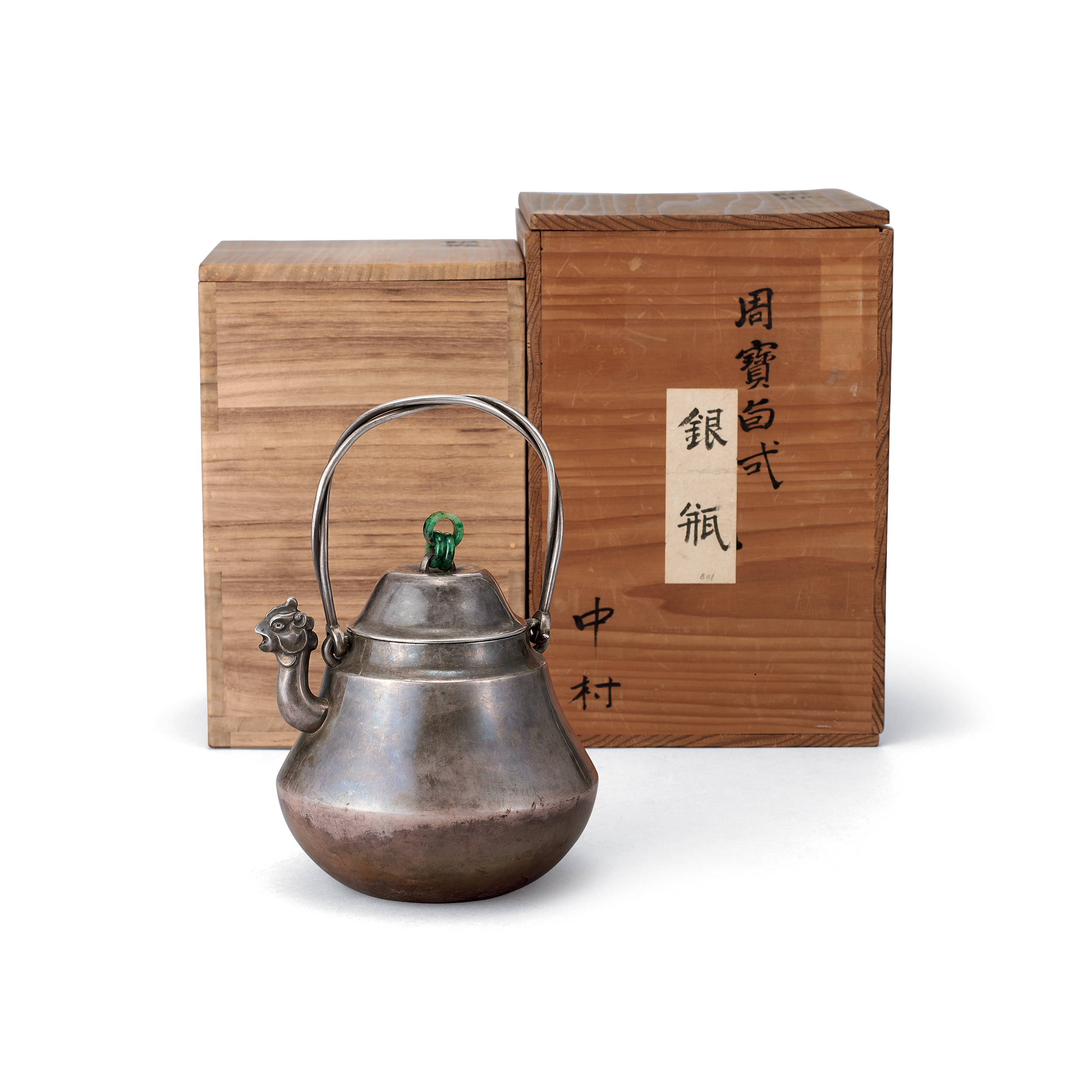 此件銀壺,造型獨特,復古感十足。整體造型十分優美,層次打造的十分唯美,提梁為兩條纏繞的銀鐵,交錯中透漏出纏綿之美。流口為藏六的獨特之富有傳統裝飾意味的獸口形,摘鈕為活環翡翠摘,與銀之盈亮感相得益彰。整件作品做工繁複,古意盎然,為不可多得的藏六精品。