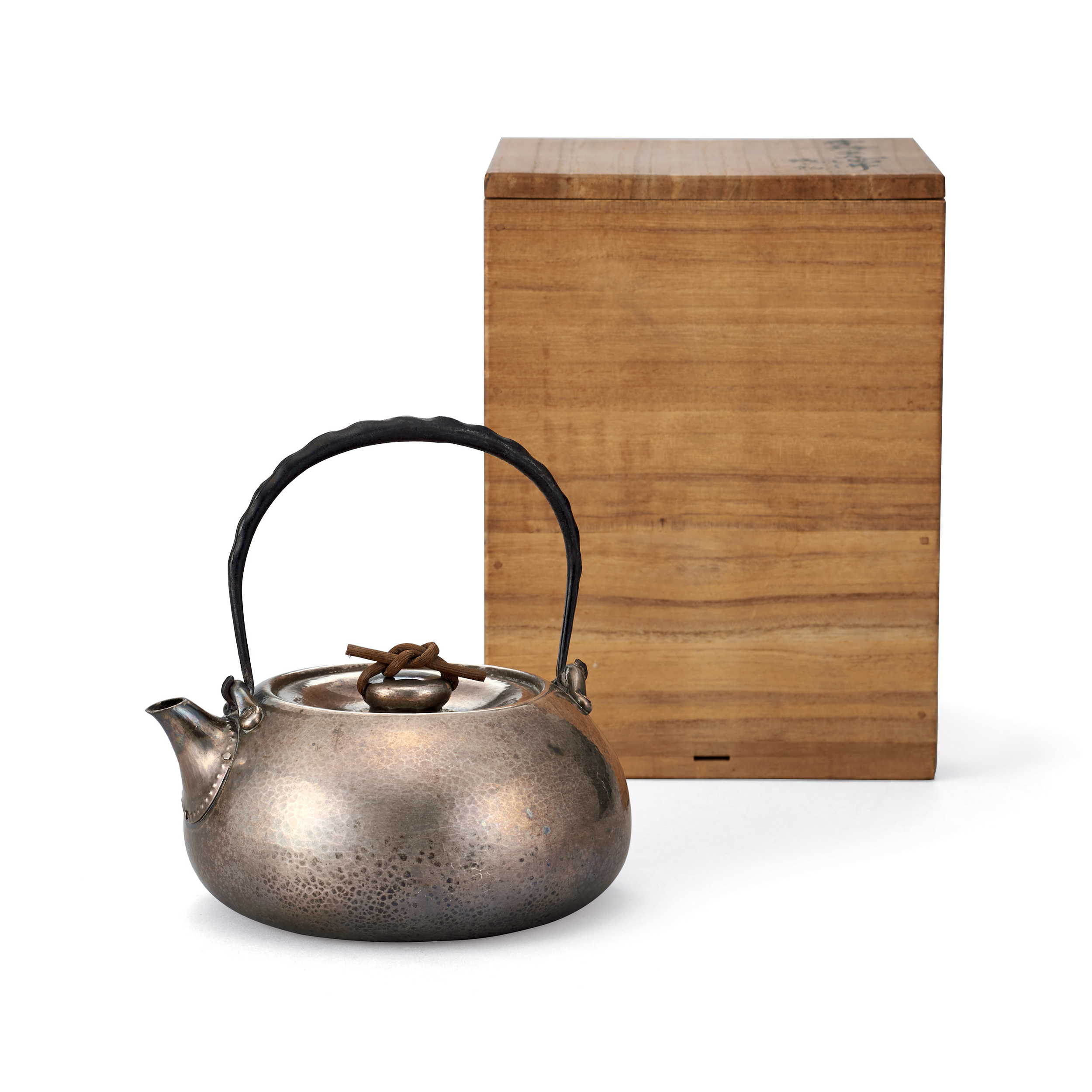 此銀壺造型圓潤飽滿,體積精巧,壺身呈袋形,渾圓飽滿,簡約短流與鐵之豆莢型提梁相得益彰。壺身光澤凝練,打造得均勻有致,每一個細節處都充滿了意趣。從整體上來說,此壺在造型之精美秀麗之餘,又不失風雅氣質,彰顯出真鍋靜良高超的金工技藝。在日本諸多傳承數代的銀壺老堂號及金工名師中,真鍋靜良與北村靜香師徒以獨門技藝“一塊造”,即捶打一體成型的制壺手法,讓不少業界人士心生仰止。